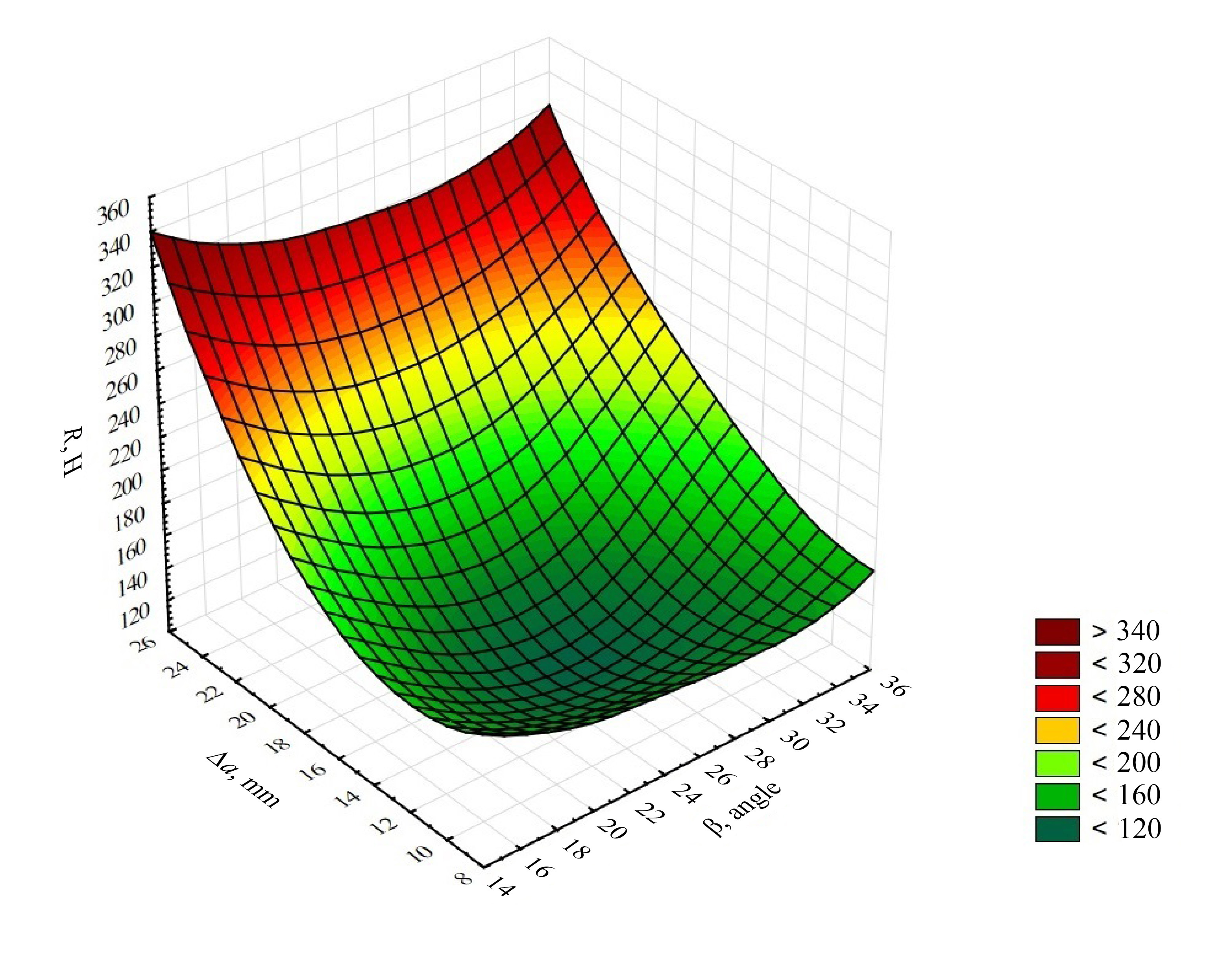 F i g. 10. Three-dimensional surface graph of dependency of draught resistance R on the angle of furrower installation and the distance between share and furrower а