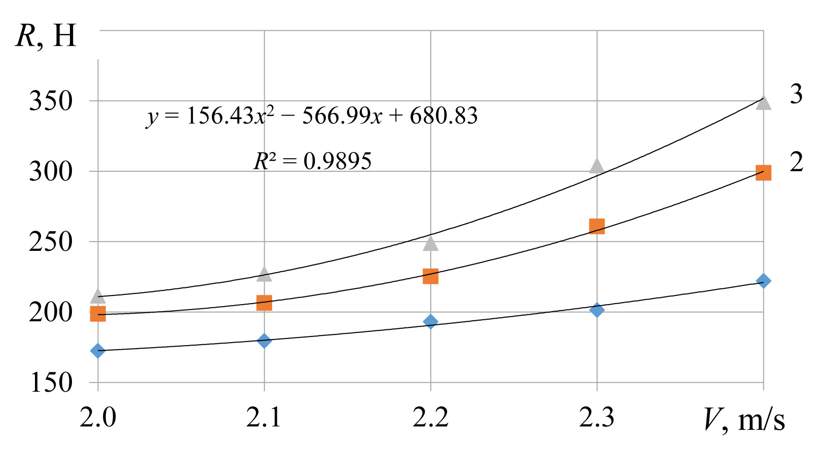 Discussion and Conclusion. From the obtained dependencies (Fig. 8) it can be seen that the coulter draught resistance R increases according to quadratic dependence which does not contradict the laws of classical agricultural mechanics.