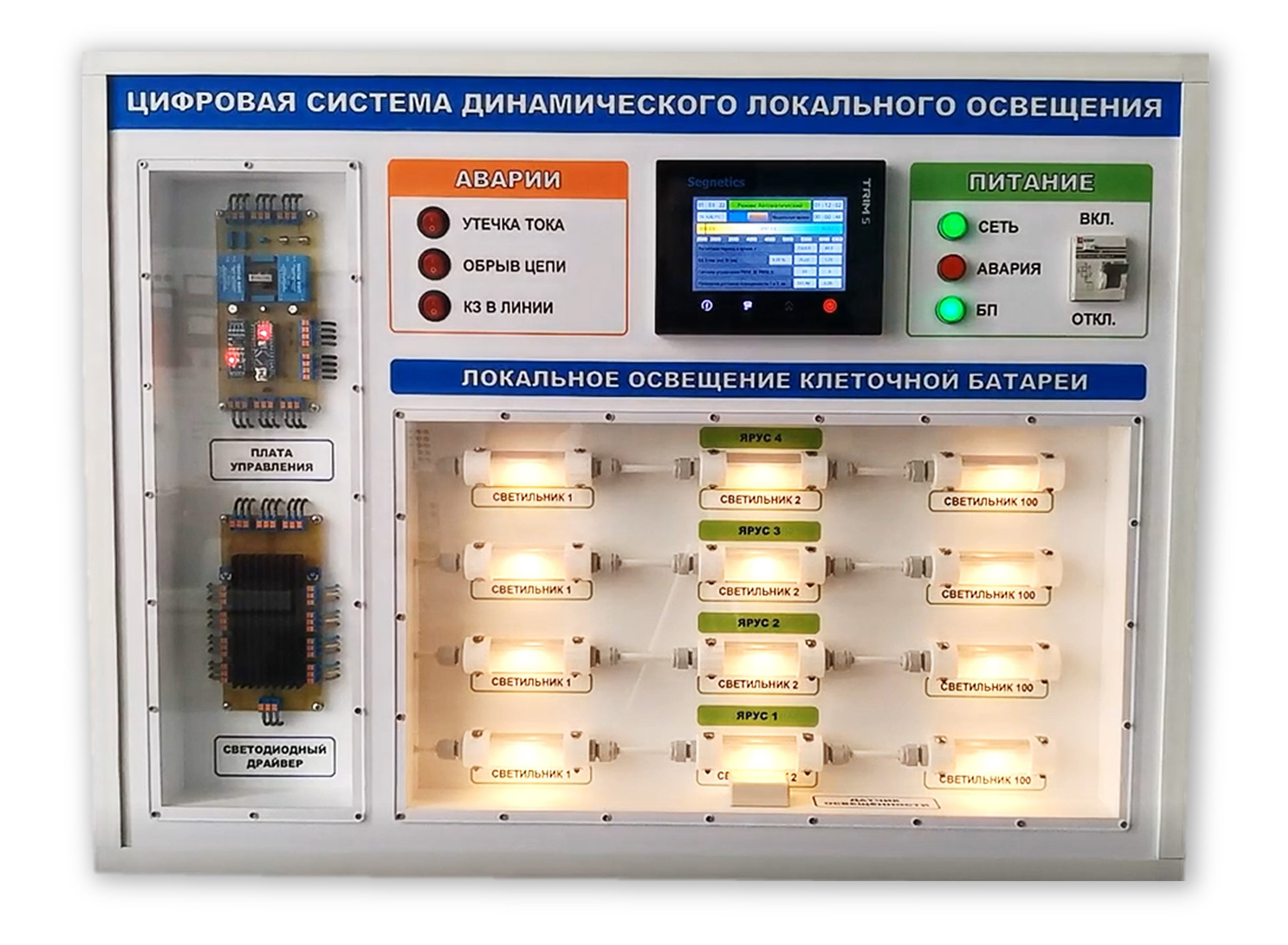 Объектом исследования является цифровая САР освещенности клеток для содержания сельскохозяйственной птицы. Исследования проводились на лабораторном образце цифровой системы динамического локального освещения, изображенном на рисунке 1, который включает в себя управляющий программируемый логический контроллер (далее − ПЛК) Trim5 фирмы Segnetics, многоканальный светодиодный драйвер (далее ‒ драйвер СИД) и плату управления с микроконтроллером ATmega328P, светодиодные светильники, датчик освещенности и дополнительное электрооборудование [10]. На боковой панели стенда расположен разъем для подключения внешних светильников и датчика освещенности (далее − ДО).