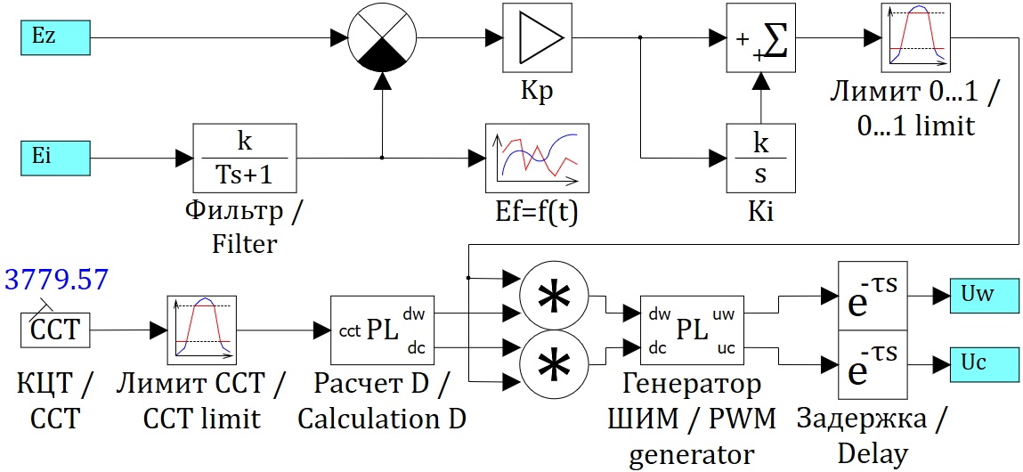 Компьютерное моделирование проводилось в среде динамического моделирования SimInTech с использованием метода интегрирования Эйлера. Постоянный шаг интегрирования 4,883∙10−7 с принят с учетом частоты и разрядности ШИМ-сигналов токов светоизлучающих диодов (далее ‒ СИД). Расчеты параметров ПИ-регулятора производились по методам CHR, ВТИ и Копеловича.