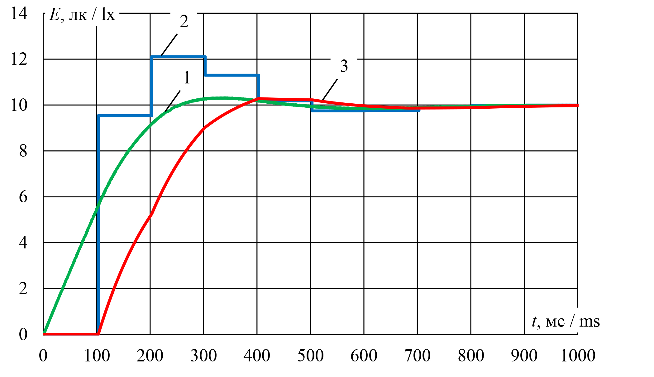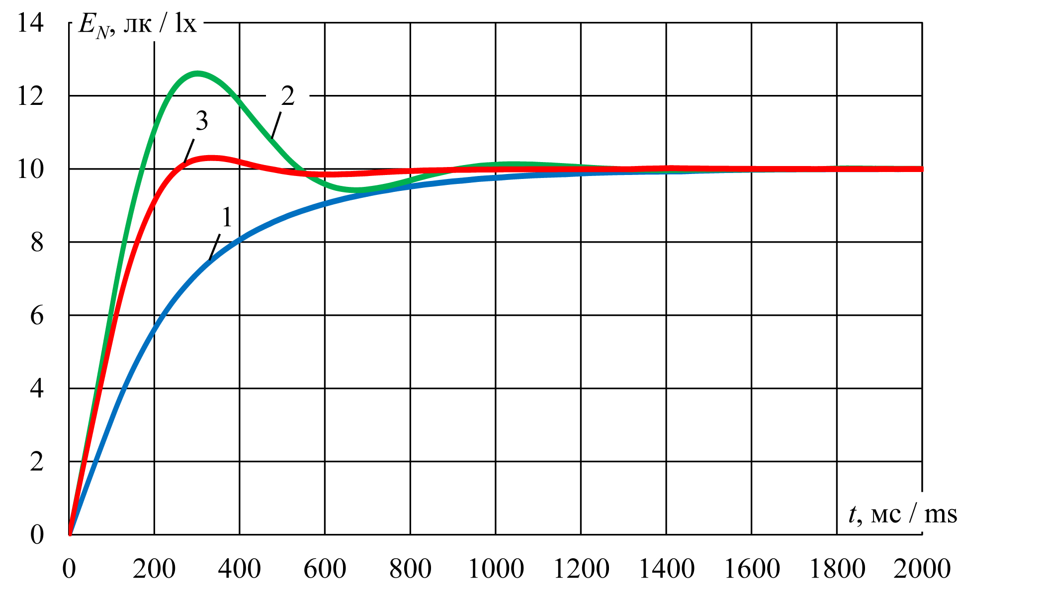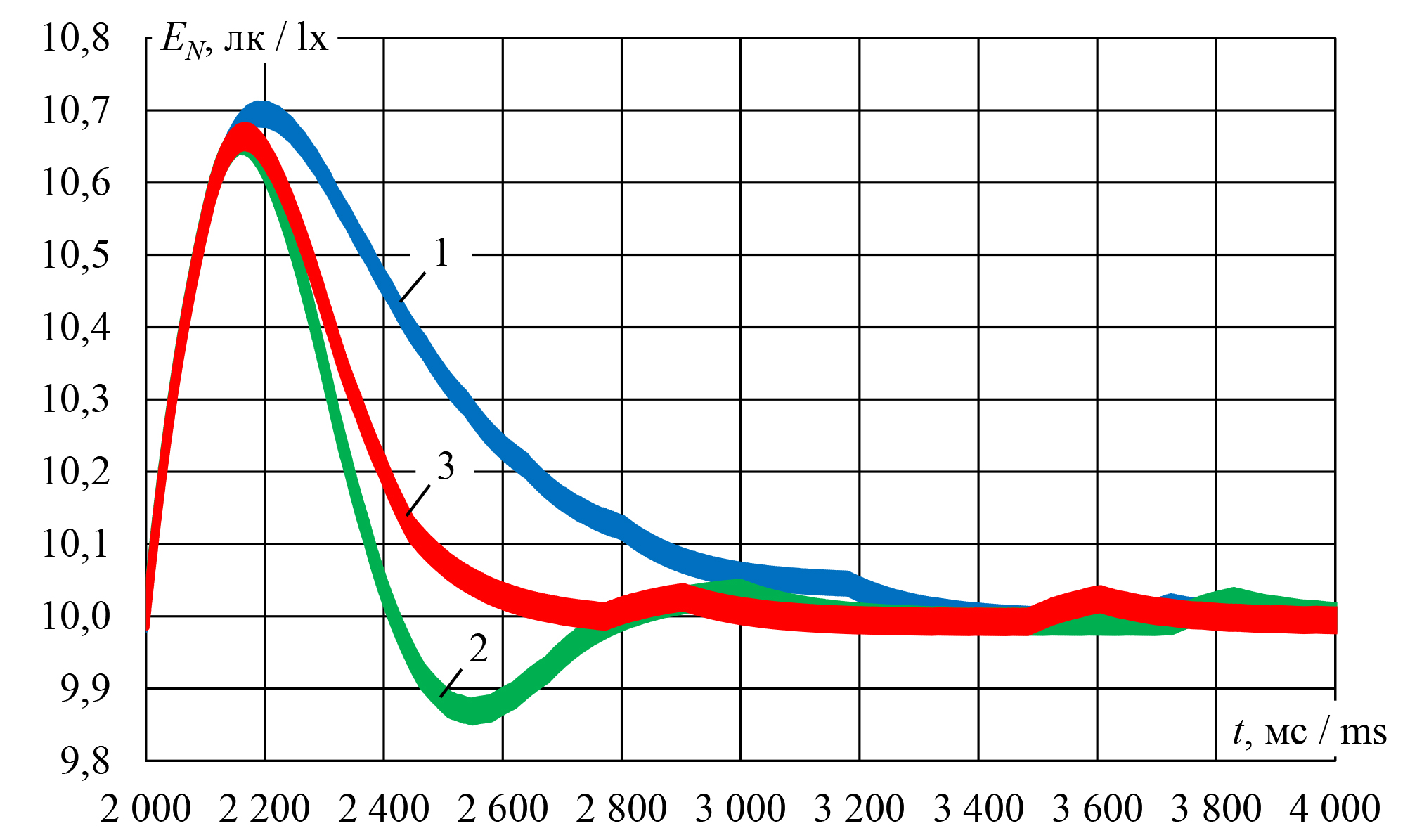 Оценка качества регулирования САР произведена для освещенности EN, которая характеризует воздействие света на наблюдателя с учетом инерционности его зрительного аппарата при восприятии импульсного светового потока (кривая 1 на рис. 8).