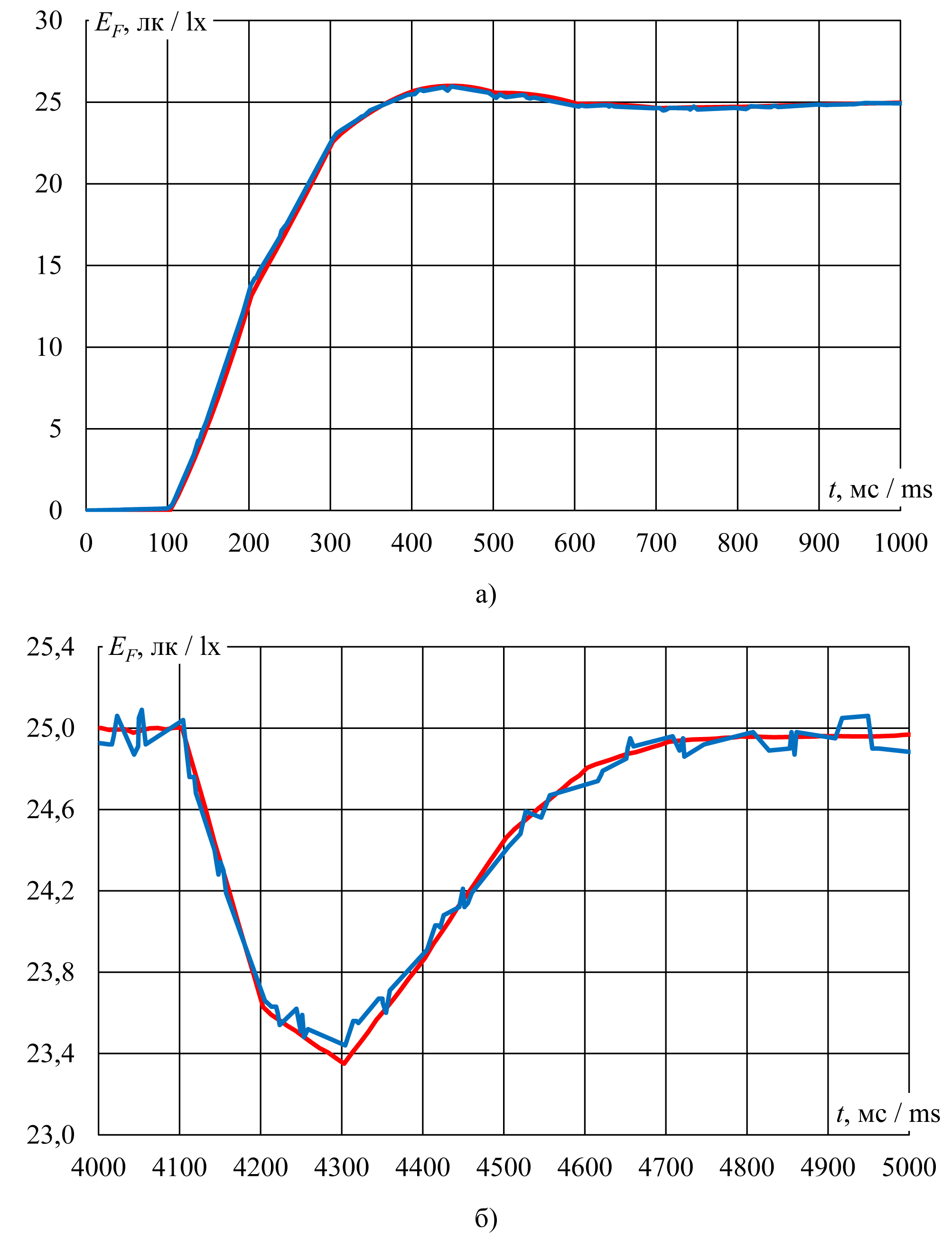 Р и с. 10. Переходные процессы в реальной САР (синяя линия) и в ее компьютерной модели (красная линия) для EZ = 25 лк: а) по задающему воздействию; б) по возмущению при ΔEV = –10 %