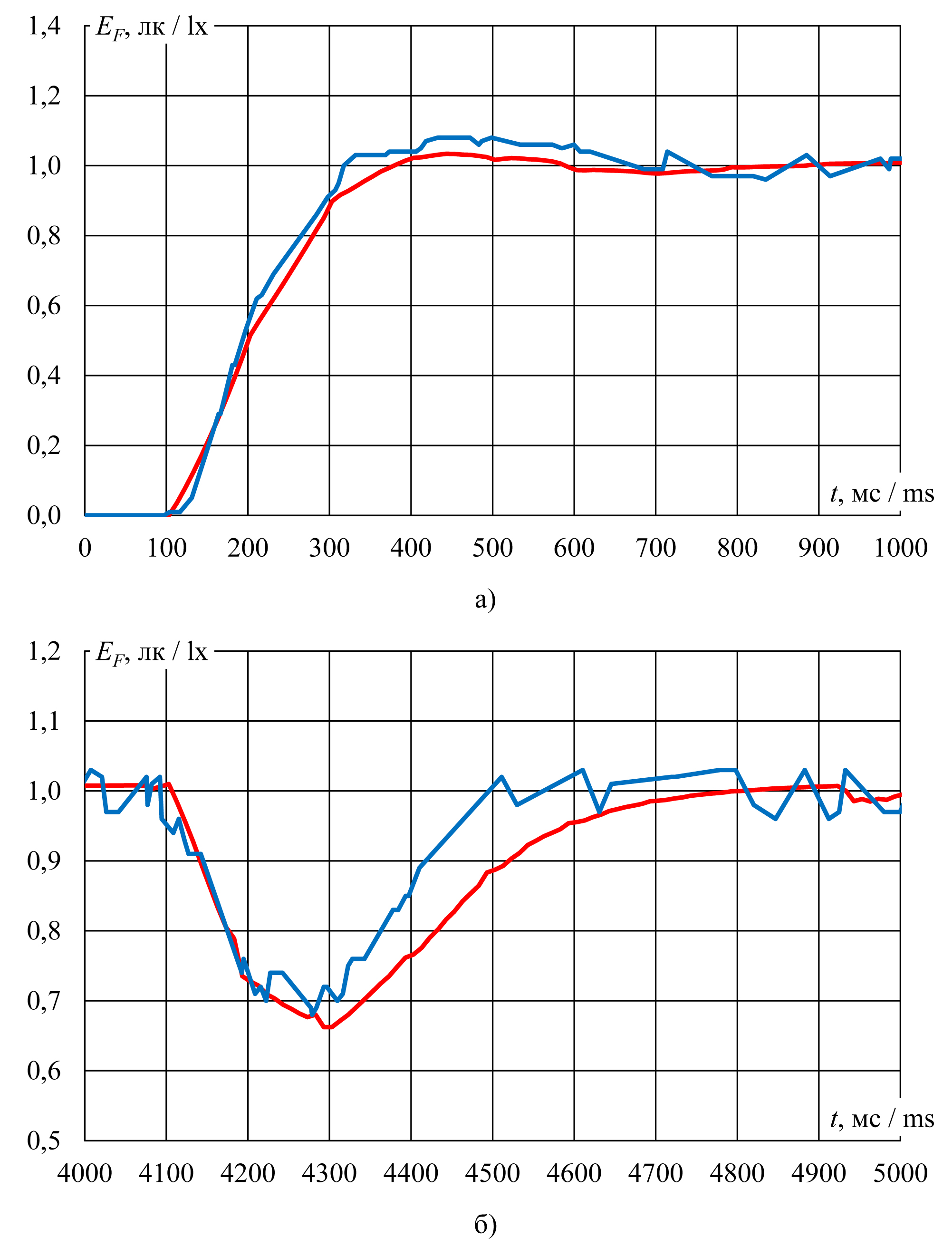 F i g. 10. Transient processes in a real ACS (blue line) and in its computer model (red line) for EZ = 25 lx: a) for a master control; b) for a perturbation action equal to ΔEV = –10 %