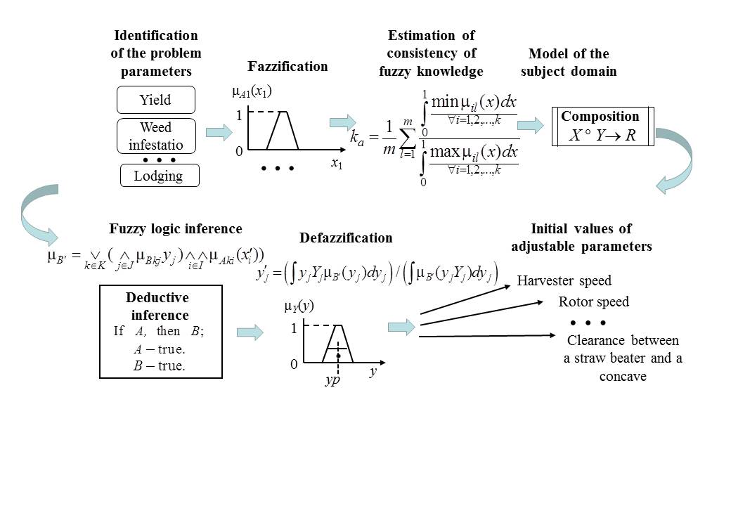 As already mentioned above, the productivity of harvesters depends largely on the operator qualification, which is not always sufficient to assess the environmental conditions and the corresponding choice of the adjustable harvester parameters. In this case, a promising direction is reducing the role of the operator while operating the harvester during field work [8]. This constituent part of design and technological solutions can be implemented through introduction of intelligent information systems in combination with automated systems for monitoring the state of environmental factors [8; 16]. Fuzzy models are used for creating these systems [11; 17; 18]. Nowadays, the expediency of using fuzzy logic for solving the problems of intelligent control does not raise doubts and is successfully applied, including for solution of the problems in the agro-industrial complex. The range of such problems is rather wide, including weeds identification, assessment of yields, assessment of the soil quality, increase of crop productivity, and efficiency of using fertilizers and others [19–21]. In [22–24], the application of this approach to the problem of assessing the values of the harvester adjustable parameters is justified.