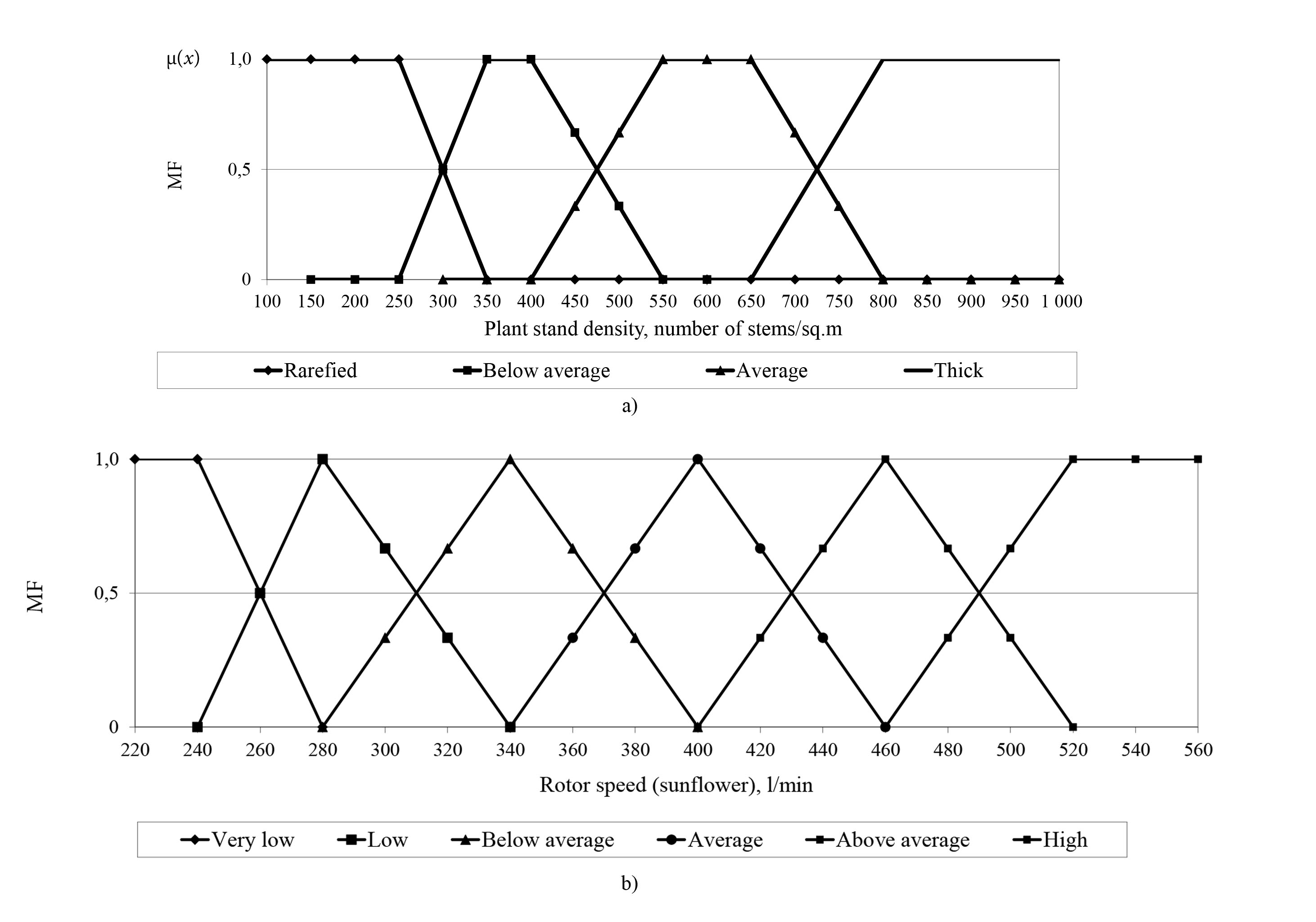As a result of modelling the subject domain, there were determined membership functions for all 9 environmental factors and 12 adjustable parameters. As an example, there is presented a linguistic description of one of the environmental factors – “plant stand density” of wheat and one of the adjustable parameters – “rotor speed”. Formally, the description of LV is presented as follows: