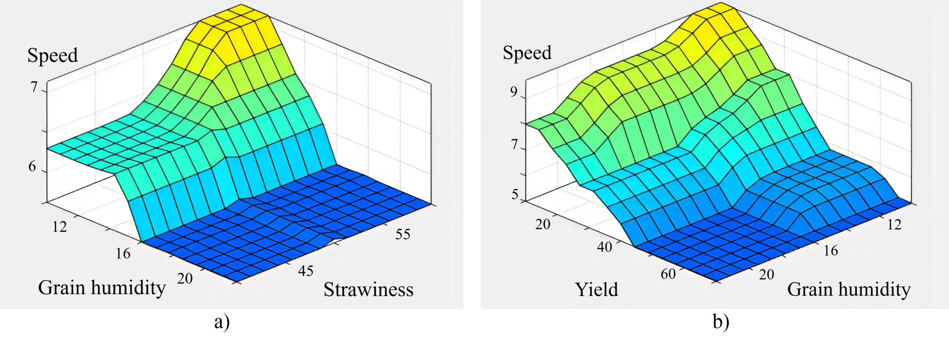 The analysis of the system of production rules carried out in MatLab (Fig. 5) confirmed the correspondence of the constructed fuzzy model of attribute relationships to the subject domain under study. All states of the system are described by the rules, the premises of which have a non-zero degree of membership. There are no contradictions in a system of rules when the rules have similar premises and mutually exclusive consequences. The monotonous nature of the surfaces confirms a sufficient degree of objectivity of the production rules. Therefore, the created system of fuzzy rules can be used for fuzzy logic inference of the adjustable parameters. For example, in Fuzzy Logic Toolbox (MatLab) package, using the “center of gravity” method with the following input variable values: wheat yield 50 c/h, weed infestation 20%, grain humidity 13%, and strawiness 60%, the recommended harvester travel speed value was 5 km/h.