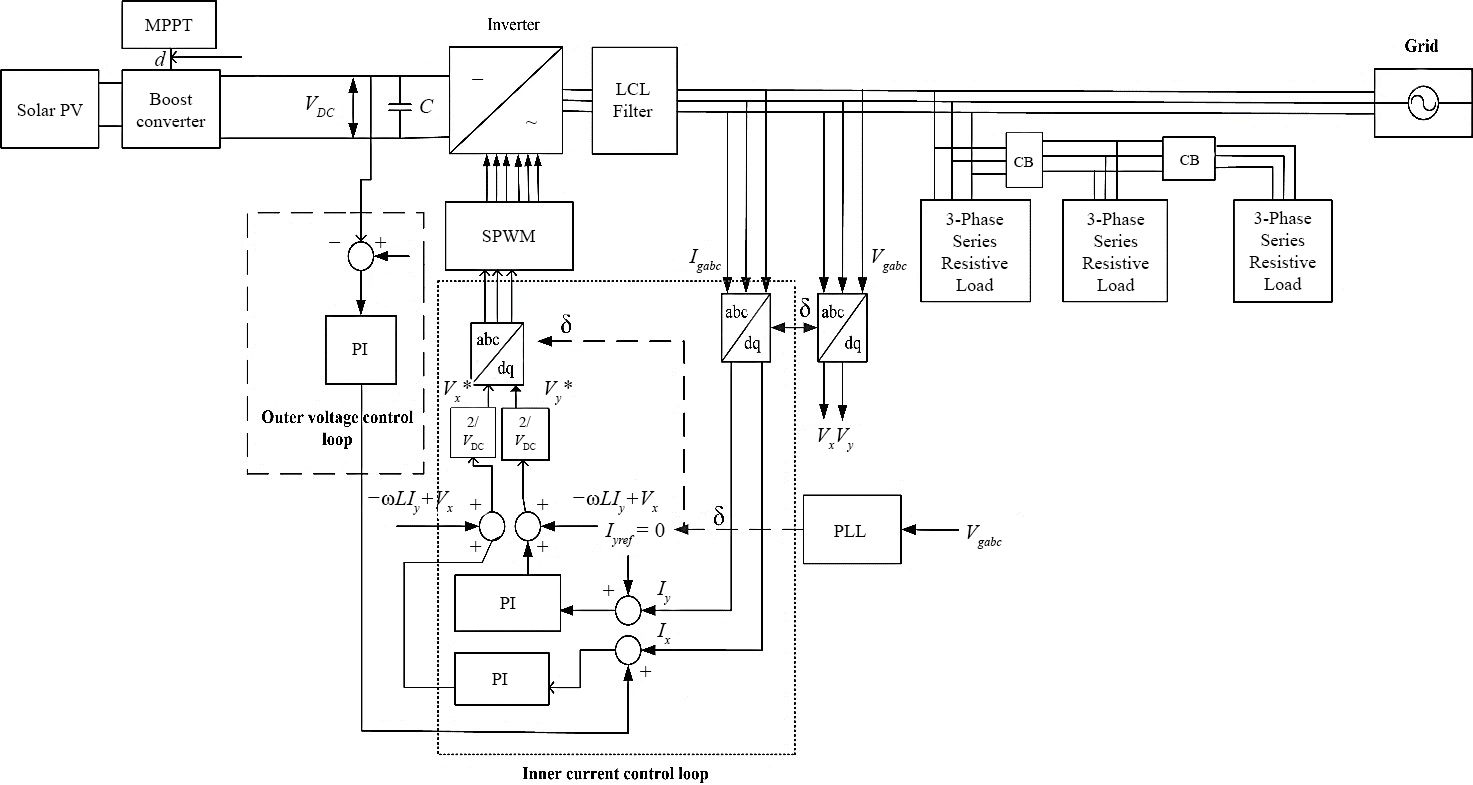 System description. The system buildup of the GCPS is given in Figure 1. PV array, boost converter with MPPT module, inverter control, local loads, and grid make up the GCPS system.