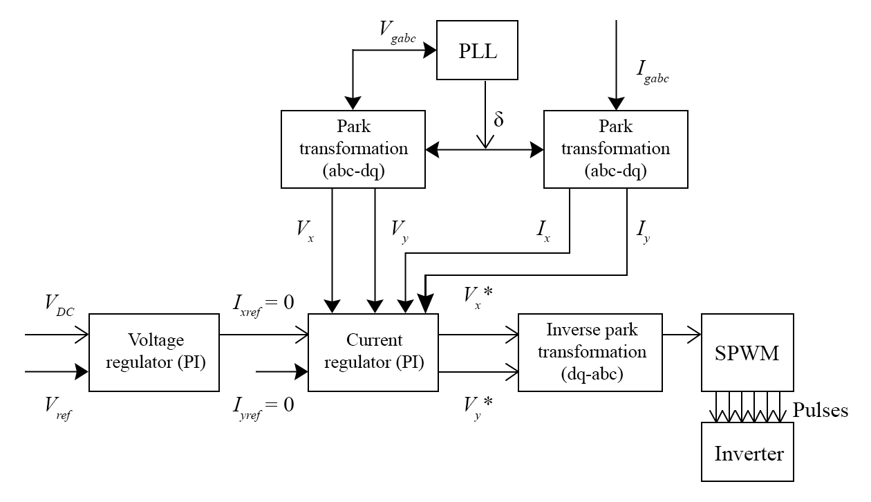 The PV system, as explained in this study, primarily operates with a PV array including 47 parallel-connected branches. Each branch is composed of 10 PV modules, resulting in a peak power output of 100.2 kWp under solar radiation of 1 000 W/sqm. The boost converter raises DC voltage from approximate 295 V to 600 V. For inverter, 3-armed converter structure is used. The inverter control section is exploited to regulate the DC-link voltage and the required value of the inverter output. The MPPT is utilized to obtain the peak power point of the PV panels. The control scheme employed to the Inverter, as illustrated in Figure 1, primarily contains dual cascaded loops: an exterior voltage control loop that modulates the DCL voltage and a fast internal current control loop that controls the grid current. All control loops are primarily regulated by PI controllers, with their gains optimally determined through the application of GA-SA and GA-PS to enhance the dynamic performance of the GCPS. The inverter controller comprises of PLL, VR and CR shown in Figure 2. The assessment of voltage and currents takes place at the point of common connection. As a result, the original frame signals undergo a transformation into a synchronized orthogonal frame (d-q) that rotates at the angular frequency of the grid. The symbol δ signifies the rotating frame angle employed for the purpose of transferring voltages and currents from the original frame signal to the (d-q) frame, and vice versa. The Vx, Vy and Ix, Iy are voltages and currents in (d-q) frame is expressed by eqs. (1), (2):