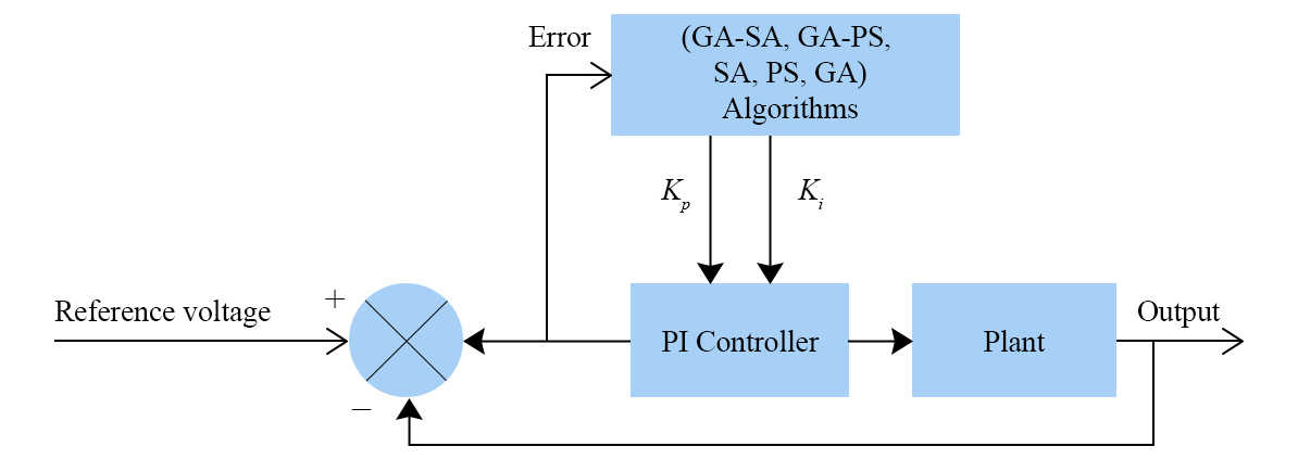 Block diagram of PI tuning by various optimization techniques. The block diagram of the PI tuning by various optimization process is shown in below Figure 3. The choice of the optimization method by GA-SA, GA-PS, SA, PS, GA to determine the parameters (Kp and Ki ).