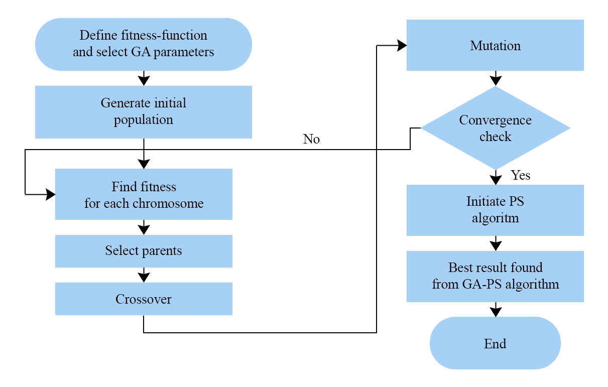 Hybrid optimization techniques. The performance of optimization techniques may vary for a given problem. In numerous instances, the utilization of hybrid techniques, using this difference, may yield superior results [13]. In this paper we use two hybrid optimizations techniques called GA-SA and GA-PS. Evolutionary algorithms, such as the genetic algorithm, are recognized as very resilient and potent global optimization methodologies employed to address complex problems characterized by multiple local optima. Nevertheless, these algorithms exhibit large computational demands and demonstrate suboptimal convergence performance. Conversely, SA and PS, when implemented as local search algorithms, can achieve convergence in a shorter amount of time; however, they do not possess a global perspective. The integration of global and local search algorithms presents the potential to harness the benefits of both optimization strategies while mitigating their respective drawbacks [14]. In GA-SA or GA-PS the result from GA is as the initial point for another optimization solver to execute a faster and more proficient local search.