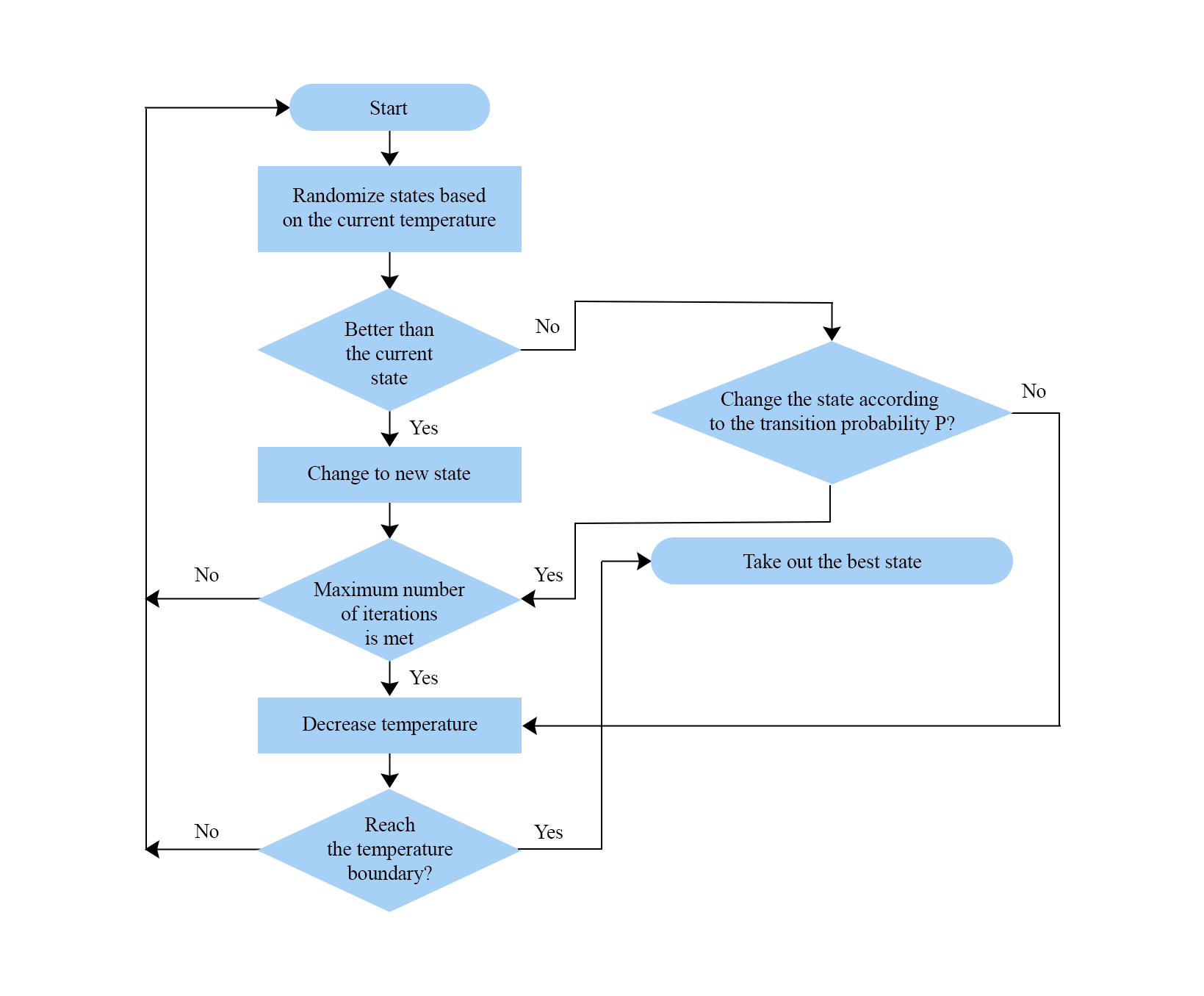 Simulated Annealing. SA to attain the optimum parameters for the PI controllers gain of VR and CR. Simulated Annealing (SA) is a metaheuristic algorithm that is commonly used to search for the global optimum of a given function. This approach is mostly employed when prioritizing the identification of a satisfactory local optimal outcome over the attainment of an exact global optimal solution within a specified timeframe [21]. The concept of SA is based on an analogy to the physical annealing process. The flow chart of SA is shown in Figure 7.