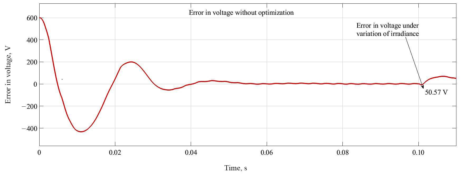 Minimization of error in DCL voltage without optimization. At t = 0.1 s, the irradiance undergoes a dynamic change, transitioning from a 1 000 W/sqm to 400 W/sqm. As illustrated from below figure 10 the errors reach around at t = 0.1 s is 50.57 V and settled after some time, this condition is not healthy for GCPV system. Figure 10 shows that the minimization of error in DCL without optimization.