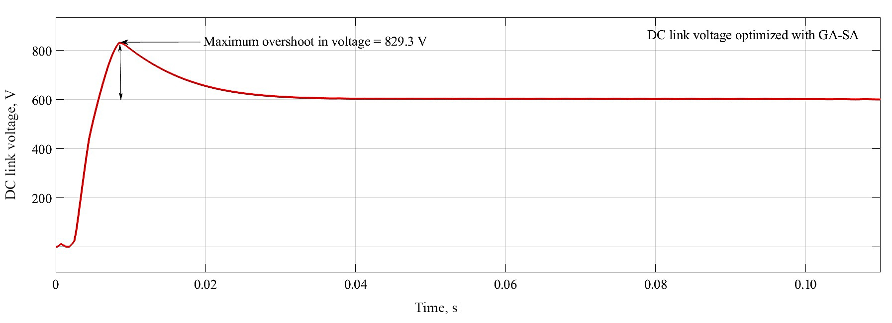 DC link voltage with GA-SA optimization. Figure 11 shows that the DCL voltage optid with GA-SA, as can be seen maximum overshoot in voltage recorded as 829.3 V and settling time is 0.037 s.