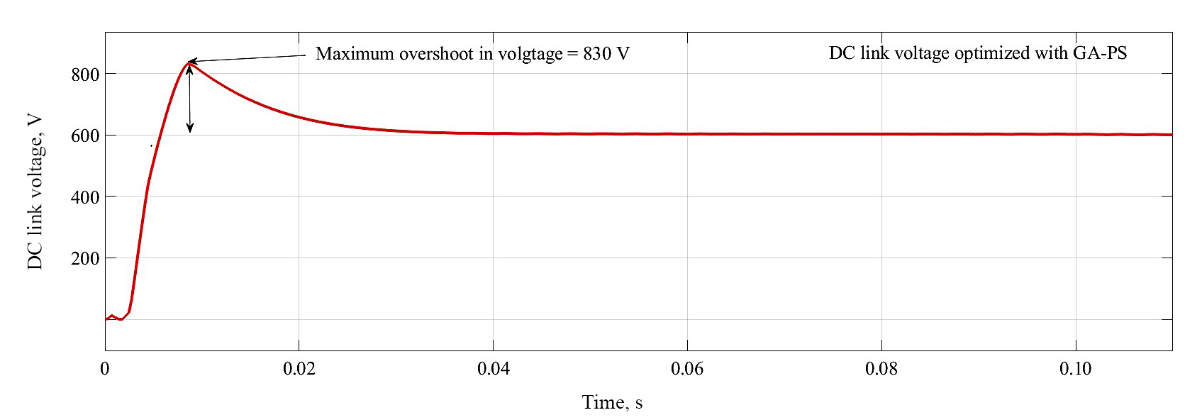 DC link voltage with GA-PS optimization. Figure 13 shows that the DCL voltage optimized with GA-PS, as can be seen maximum overshoot in voltage recorded as 830 V and settling time is 0.0371 s.