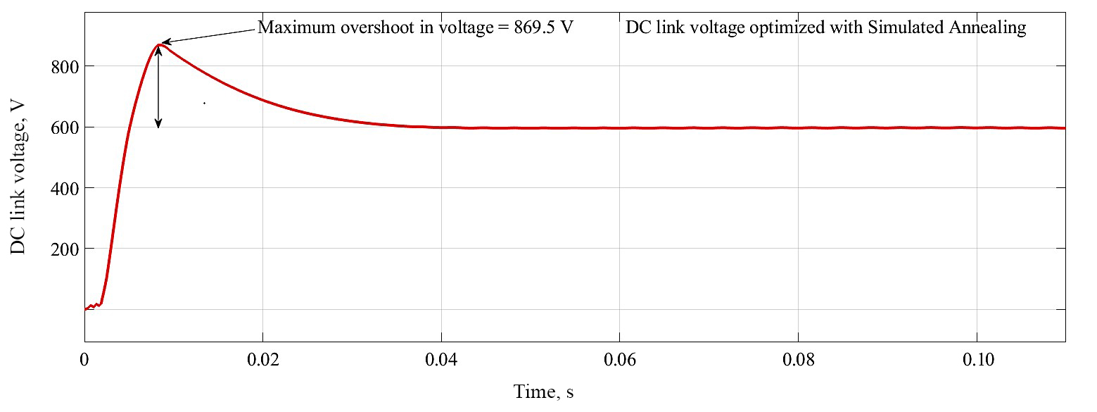 DC link voltage with simulated annealing optimization. Figure 15 shows that the DCL voltage optimized with simulated annealing, as can be seen maximum overshoot in voltage recorded as 869.5 V and settling time is 0.039 s.