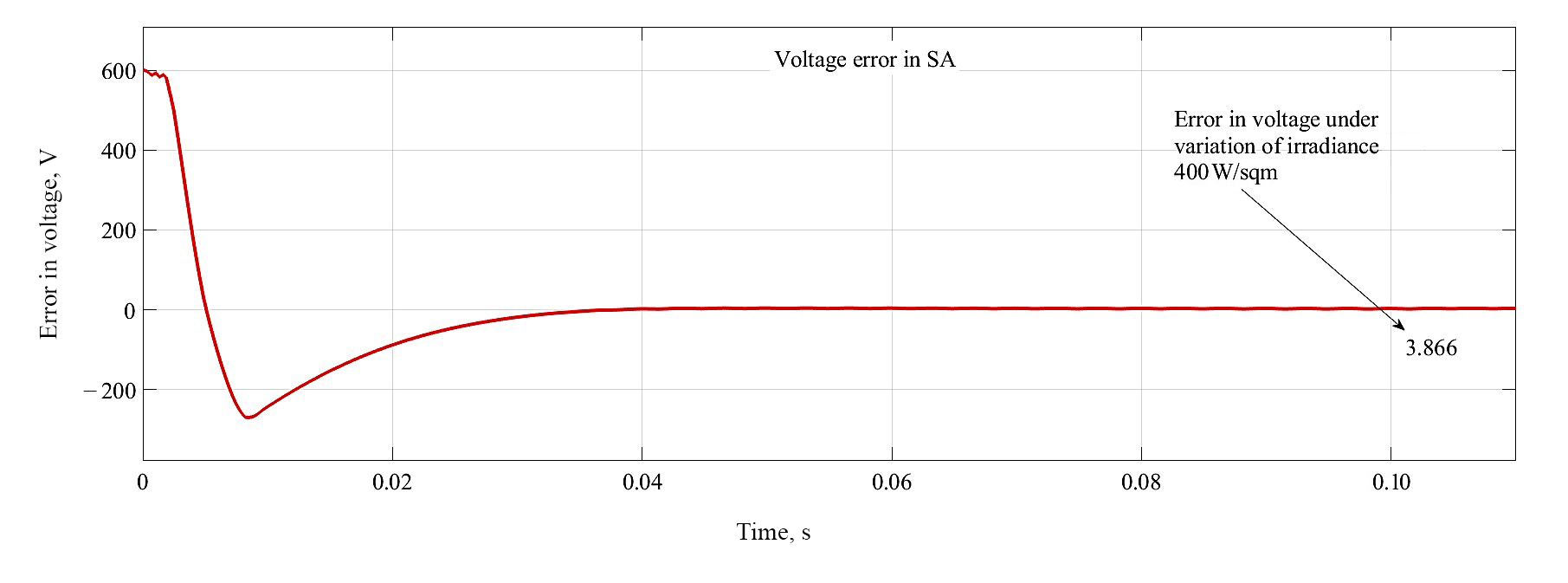 Minimization of error in DCL voltage with GA-SA optimization. Solar insolation is varied as of 1 000 W/sqm to 400 W/sqm at t = 0.1 s. As illustrated from Figure 12 the errors reach around at t = 0.1 s is 0.6090 V very close to zero.