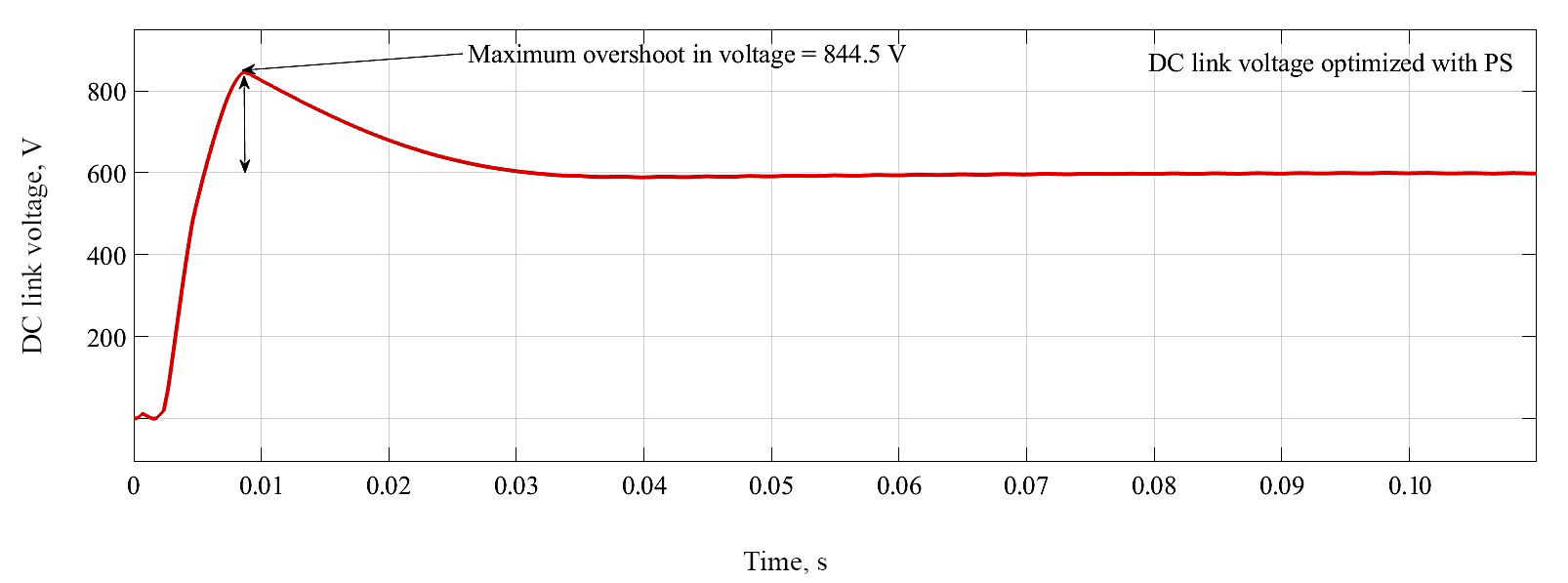 DC link voltage with pattern search optimization. Figure 17 shows that the DCL voltage optimized with pattern search, as can be seen maximum overshoot in voltage recorded as 844.5 V and settling time is 0.063 s.