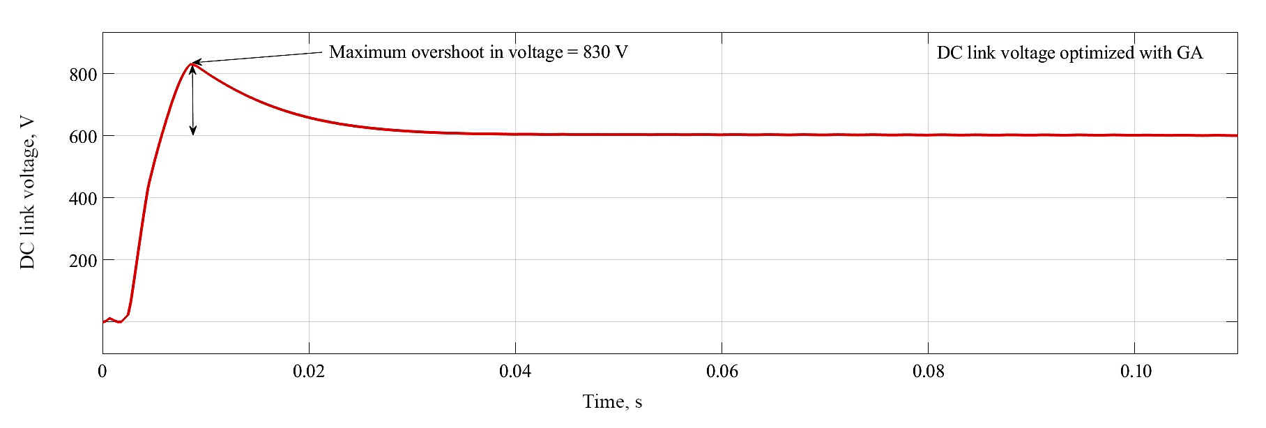 DC link voltage with genetic algorithm optimization. Figure 19 shows that the DCL voltage optimized with genetic algorithm, as can be seen maximum overshoot in voltage recorded as 830 V and settling time is 0.03 s.