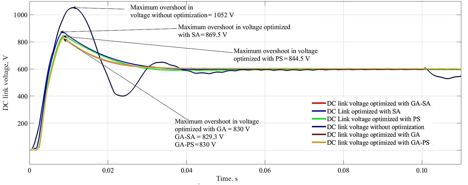 Comparative analysis of DC link voltage based on optimization. A comparison of the GA-SA and GA-PS method with other renowned PI tuning methods examined in this paper was made for GCPV system on the basis of DC link voltage peak, rise time, peak time and settling time and the achieved results are illustrated in Table 3.