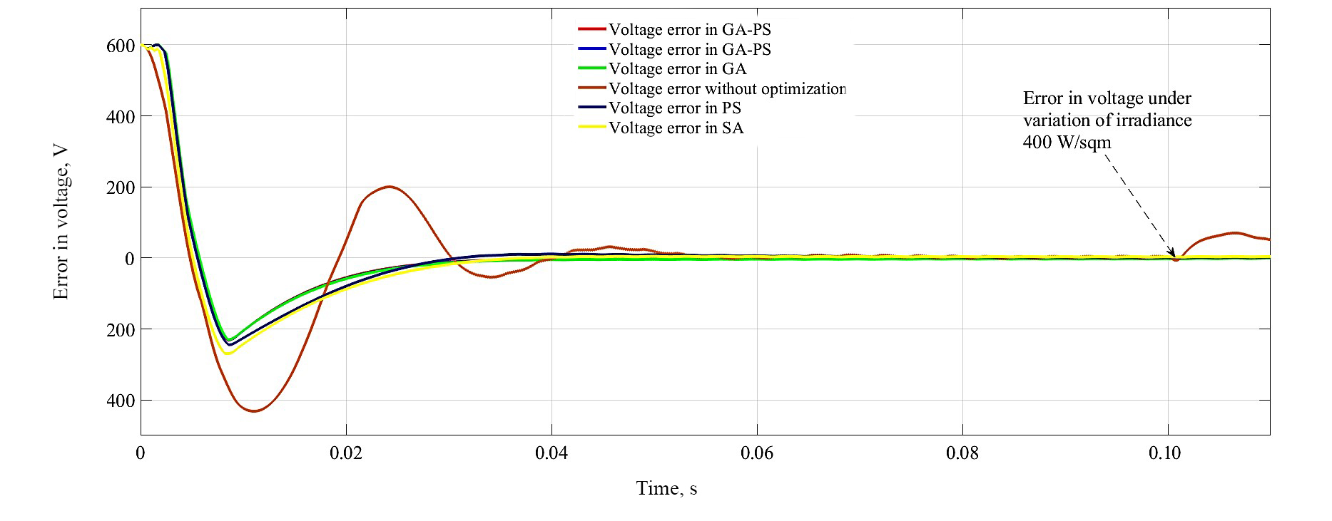 Comparative analysis of minimization of error in DCL voltage under variation of irradiance. As illustrated from Figure 22 the errors reach around under variation of solar insolation from 1 000 W/sqm to 400 W/sqm at t = 0.1 s, for GA-SA optimization techniques the error in DCL voltage at variation of irradiance is 0.6090 V and for GA-PS is 0.6078 V as well when optimized by GA, SA and PS the error in voltage under variation of irradiance is 0.6152, 3.8660 and 1.6430 respectively. Clearly shows that when technique is hybridized the error in voltage is less under variation of irradiance.