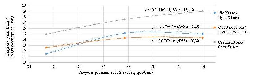 Fig. 3. А Graph of regression functions characterizing the dependence of energy consumption on the working element shredding speed when shredding branches of different diameters