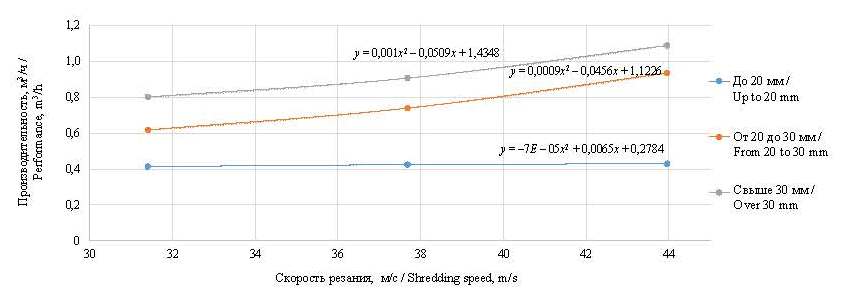 Для веток диаметром до 20 мм: при скорости резания 31,4 м/с производительность равна 0,4138 м³/ч; при скорости резания 37,68 м/с – 0,4246 м³/ч; при скорости резания 43,96 м/с – 0,4300 м³/ч. Для веток меньшего диаметра увеличение скорости резания приводит к более слабо выраженному росту производительности. Несмотря на повышение скорости, производительность не достигает значений, близких к 0,8 м³/ч, что объясняется меньшим объемом измельчаемой массы.