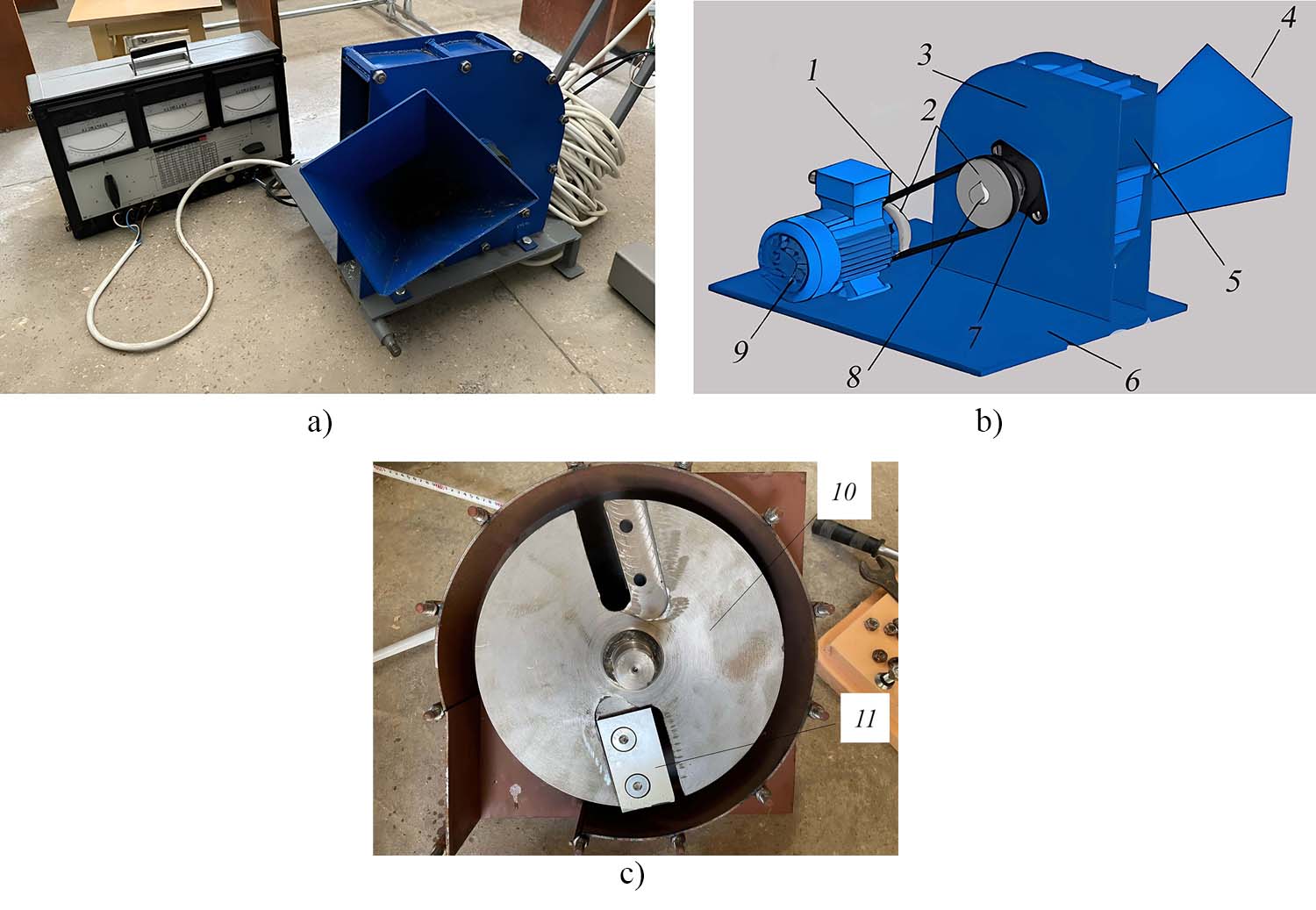 a) общий вид; b) модель измельчителя: 1 – ременная передача; 2 – шкивы; 3 – корпус; 4 – загрузочная горловина; 5 – выгрузное отверстие; 6 – платформа; 7 – подшипники; 8 – вал; 9 – электродвигатель; c) рабочий орган измельчителя: 10 – металлический массивный диск; 11 – ножи
