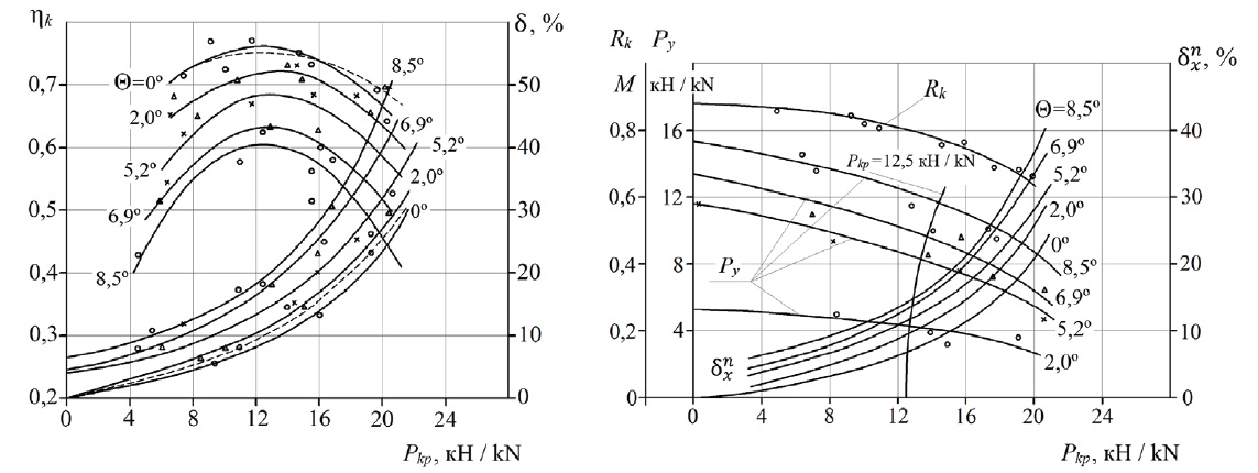 Данные испытаний шины 30,5R-32 [10; 38] на модуле «шинный тестер» [39] однозначно показывают смещение графиков, отображающих функции ηm(Pm ), с ростом угла ее бокового увода в сторону снижения тягового КПД и усилия тяги, в то время как графики функций δ(Pm ) смещаются в сторону возрастания значений буксования.