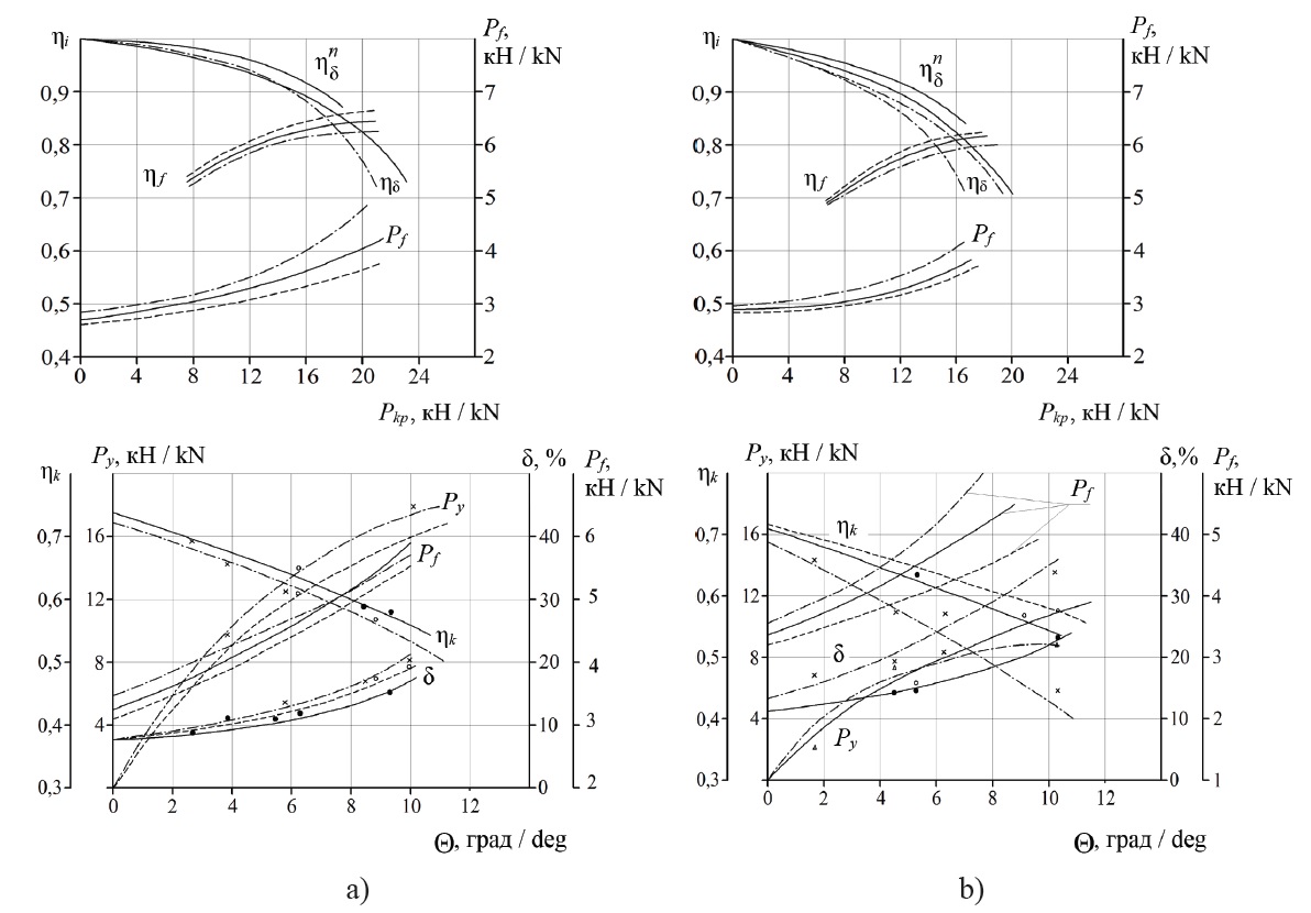 Анализ зависимостей (3) и (4) однозначно показывает, что при движении шины с боковым уводом тягово-энергетические показатели движителя снижаются: с ростом угла увода тяговое усилие Pm, создаваемое ведущим колесом, и его тяговый КПД ηm становятся меньше. Это объясняется возникновением дополнительных потерь при движении колеса в элементах шины и почвенном основании, а также противодействием составляющей боковой силы тяговому усилию. При этом процесс качения с боковым уводом сопровождается повышенным буксованием движителя за счет увеличения деформации сдвига почвы, что определяет снижение ηm.