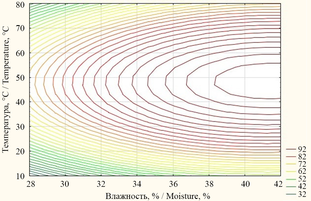 На рисунке 2 показано двумерное сечение поверхности отклика, характеризующее зависимость времени распада гранул корма от температуры и влажности сырья. Из графика на рисунке 2 видно, что влажность сырья существенно влияет на водостойкость гранул, в то время как влияние температуры сырья менее существенно. График показывает, что повышение влажности сырья до 42 % и его температуры до 56 °С приводит к увеличению времени распада гранул в воде. Наилучший результат, при котором время распада гранул составляет 92 мин, достигается при влажности сырья 38–42 % и температуре 41–56 °С. При увеличении значений факторов выше этого диапазона происходит снижение времени распада гранул.
