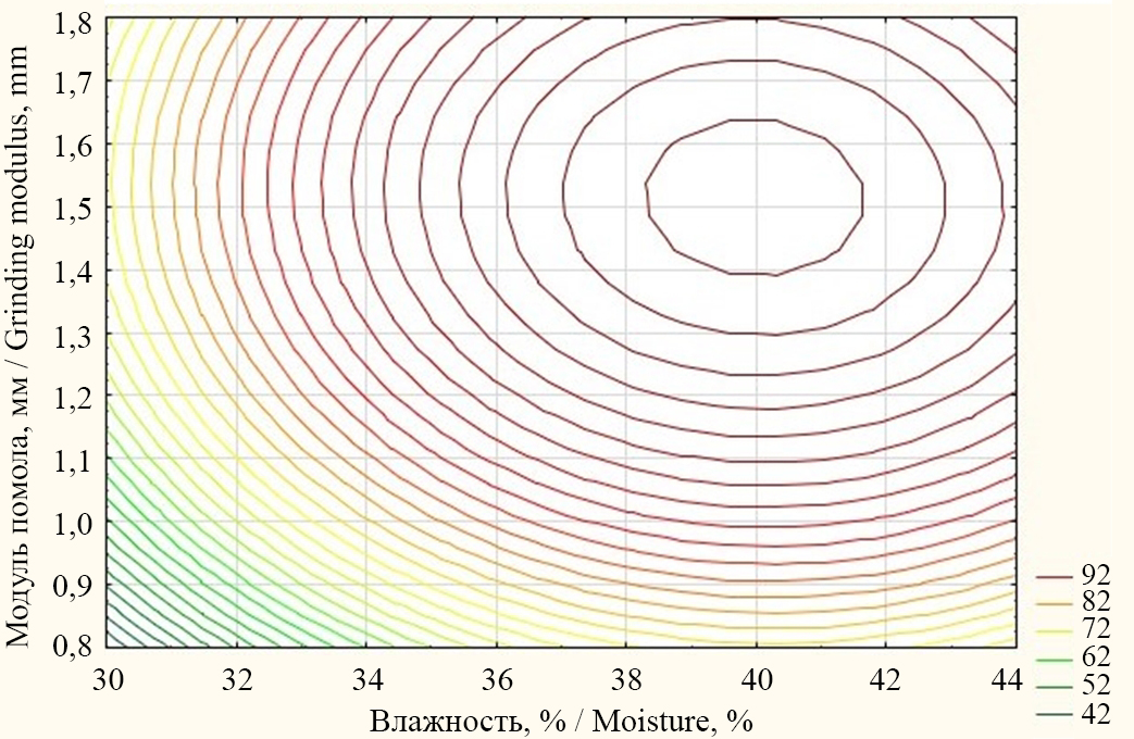 На рисунке 3 показано двумерное сечение поверхности отклика, характеризующее зависимость времени распада гранул корма от модуля помола сырья и его влажности. Из графика на рисунке 3 следует, что наилучший результат процесса гранулирования, при котором время распада гранул корма составляет 92 мин, достигается при влажности сырья 38,2–41,6 % и модуле помола 1,39–1,64 мм. Время распада гранул увеличивается при повышении значений факторов до 41,6 % и 1,64 мм, после чего уменьшается. Результаты эксперимента показывают, что величина модуля помола сырья играет существенную роль в получении водостойких гранул корма.