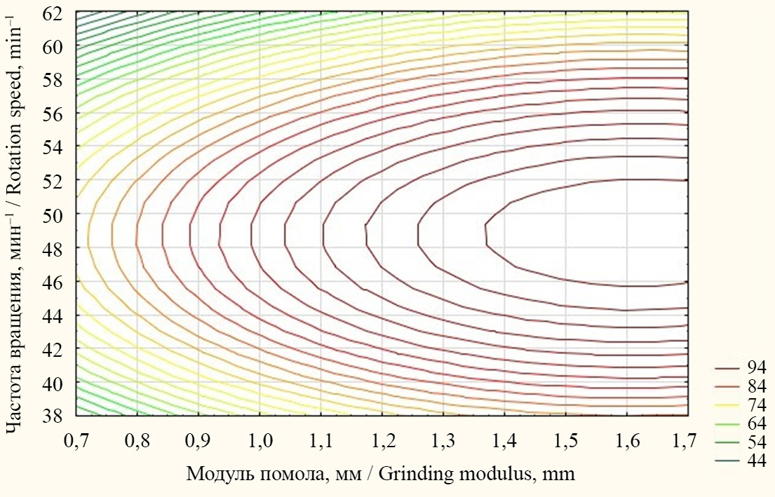 На рисунке 7 показано двумерное сечение поверхности отклика, характеризующее зависимость времени распада гранул корма в воде от модуля помола и частоты вращения рабочих органов корзинного гранулятора. Из графика на рисунке 7 следует, что наилучший результат гранулирования, при котором время распада гранул максимально и составляет 94 мин, достигается при значениях модуля помола 1,36–1,80 мм и частоты вращения рабочих органов гранулятора 45,8–52,0 мин–1. При увеличении значений модуля помола до 1,8 мм и частоты вращения рабочих органов до 52 мин–1 происходит повышение длительности распада гранул, которое при дальнейшем увеличении значений этих факторов сменяется снижением водостойкости гранул корма.