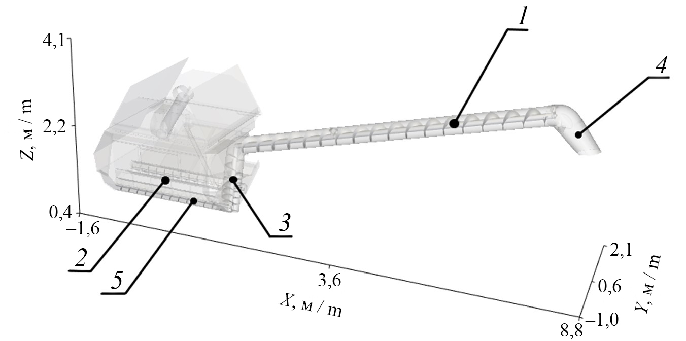 В качестве объекта исследования выбрана система выгрузки зерноуборочного комбайна, представленная на рисунке 1. Данная система имеет в своем составе горизонтальный шнек 5, вертикальный шнек 3 и горизонтальный выгрузной шнек 1.