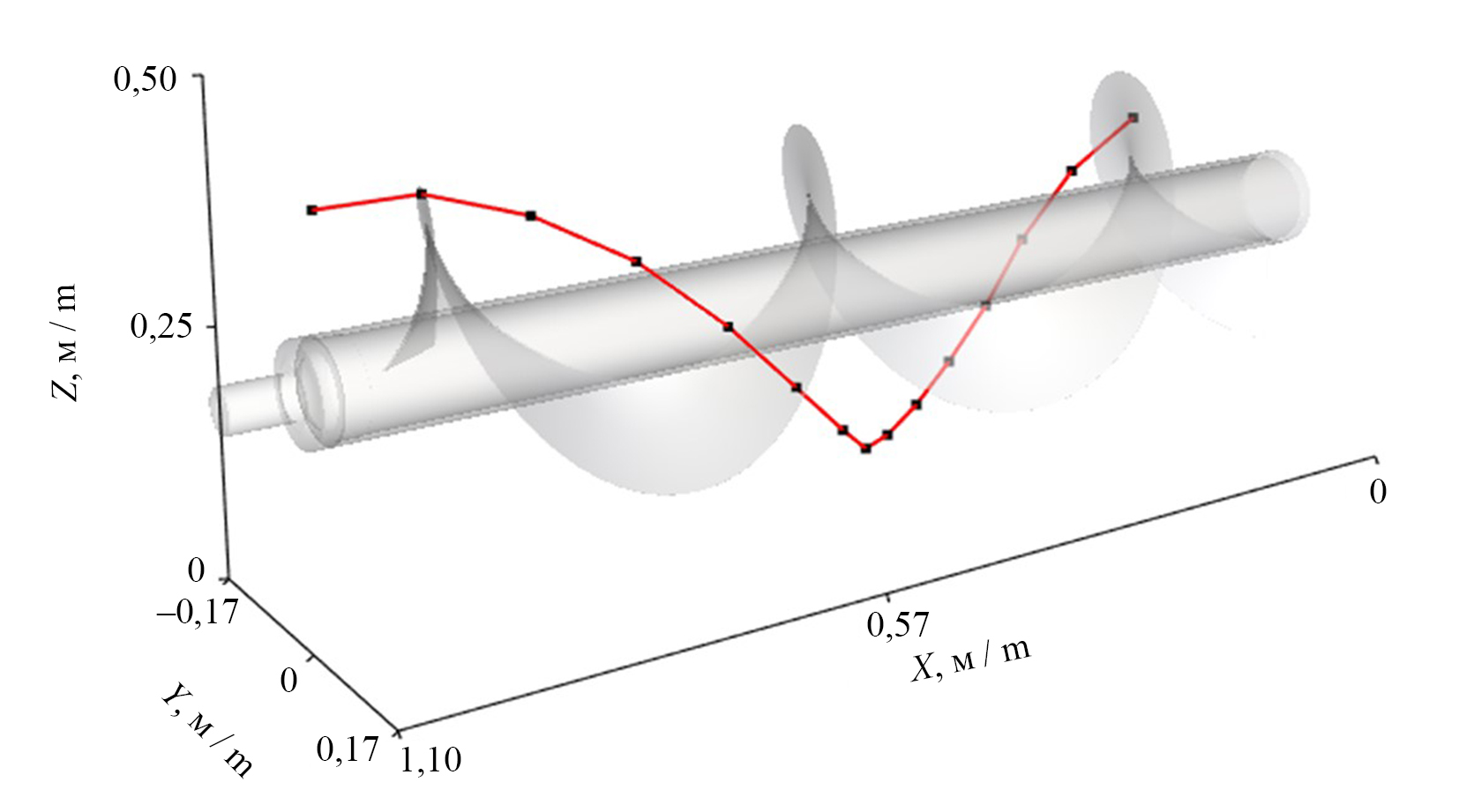 Рис. 4. Траектория частицы пшеницы по длине шнека