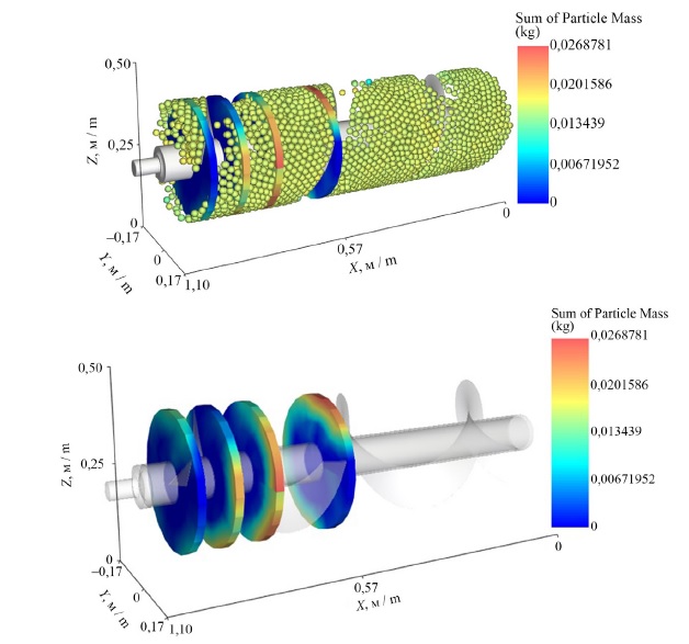 Более совершенным для описания процесса транспортировки сыпучей среды является метод дискретных элементов (DEM – Discrete Element Method), имеющий широкое применение в моделировании процессов функционирования рабочих органов сельскохозяйственных машин [13] и позволяющий учитывать не только влияние геометрии транспортирующего рабочего органа (шнека), но взаимовлияние транспортируемых частиц [14; 15].