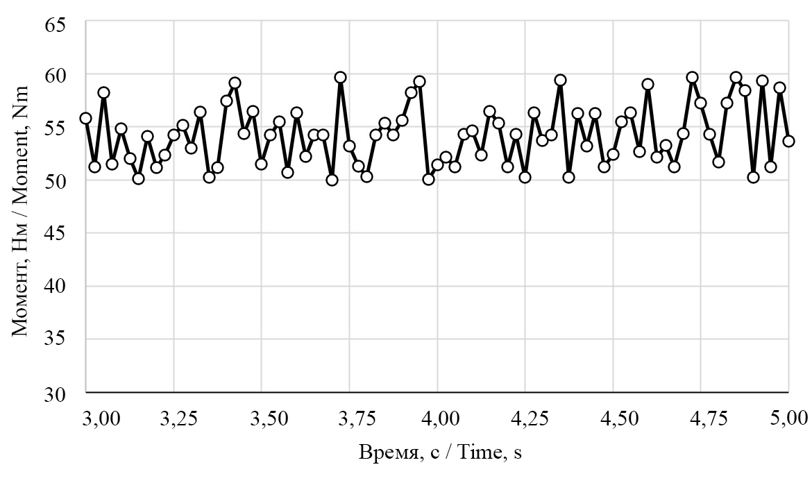 Рис. 6. Расчетные значения крутящего момента, приложенного к шнеку при транспортировке пшеницы в промежутке времени исследования