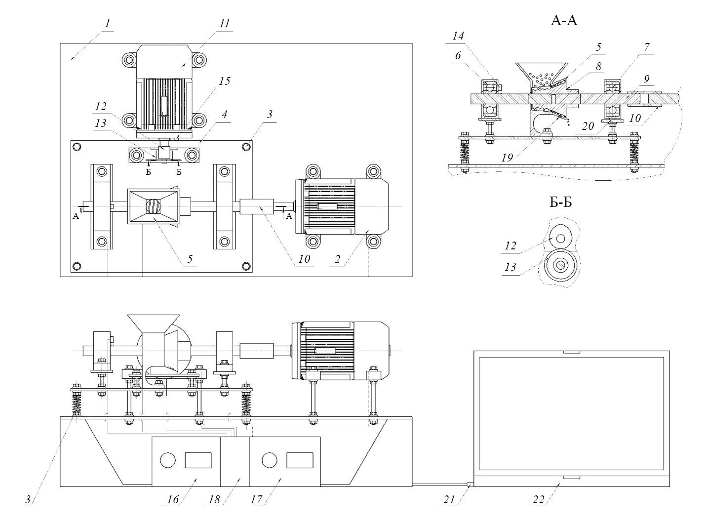 1 – frame; 2 – electric commutator motor; 3 – spring fasteners; 4 – movable platform; 5 – fixed body; 6 – horizontal shaft; 7, 8 – friction bearings; 9 – barley grain; 10 – coupling; 11 – electric commutator motor; 12 – toothed surface; 13 – pusher; 14, 15 – speed sensors; 16, 17 – control panels; 18 – microcontroller; 19 – temperature sensor; 20 – strain gauge force sensor; 21 – USB-cable; 22 – personal computer