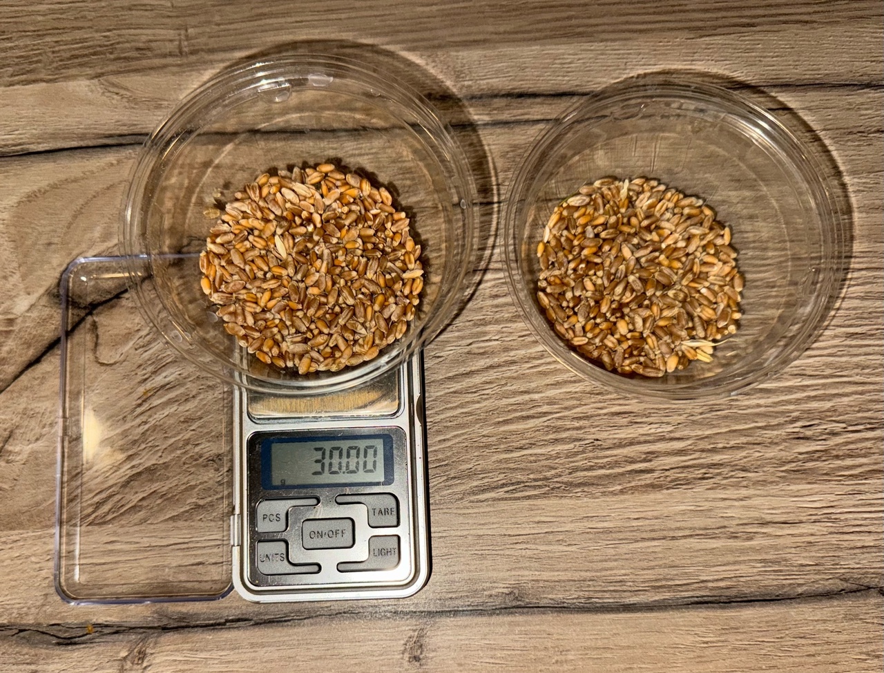 Для оценки влияния внешнего колебательного воздействия, прилагаемого с частотой собственных колебаний зерна ячменя, на производительность мельницы была проведена серия экспериментов. Методика заключалась в сравнительном анализе времени, необходимого для размола одинаковых партий зерна ячменя, с приложением внешнего колебательного воздействия и без него. Используемые партии зерна ячменя были предварительно взвешены с высокой точностью на лабораторных весах, что позволило исключить влияние различий в массе на результаты эксперимента (рис. 8).