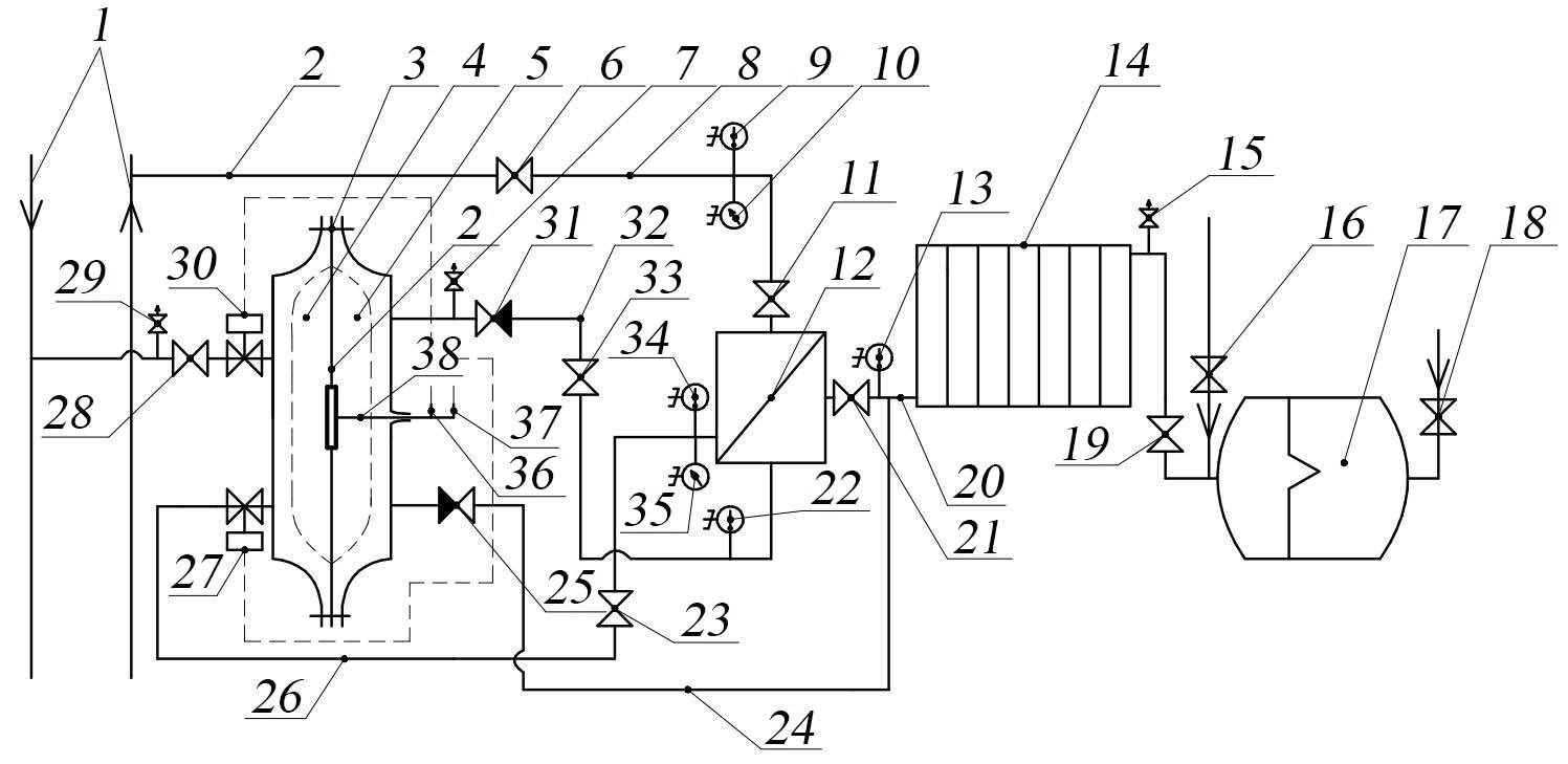 1 – тепловая сеть; 2 – диафрагма мембранного насоса; 3 – мембранный насос; 4 – рабочая зона мембранного насоса внешнего контура; 5 – рабочая зона мембранного насоса внутреннего контура; 6, 11, 21, 23, 28, 33 – задвижки; 7, 15, 19, 29 – спускные вентили; 8, 24, 26, 32 – соединительные трубопроводы; 9, 13, 22, 34 – электро-датчики температуры; 10, 35 – электродатчики давления; 12 – теплообменник независимого подключения; 14 – радиатор воздушного отопления; 16, 18 – краны; 17 – гидроаккумулятор; 20 – реверсивный трубопровод; 27, 30 – электромагнитные клапан; 25, 31 – обратные клапана; 36, 37 – микропереключатели; 38 – шток мембранного насоса