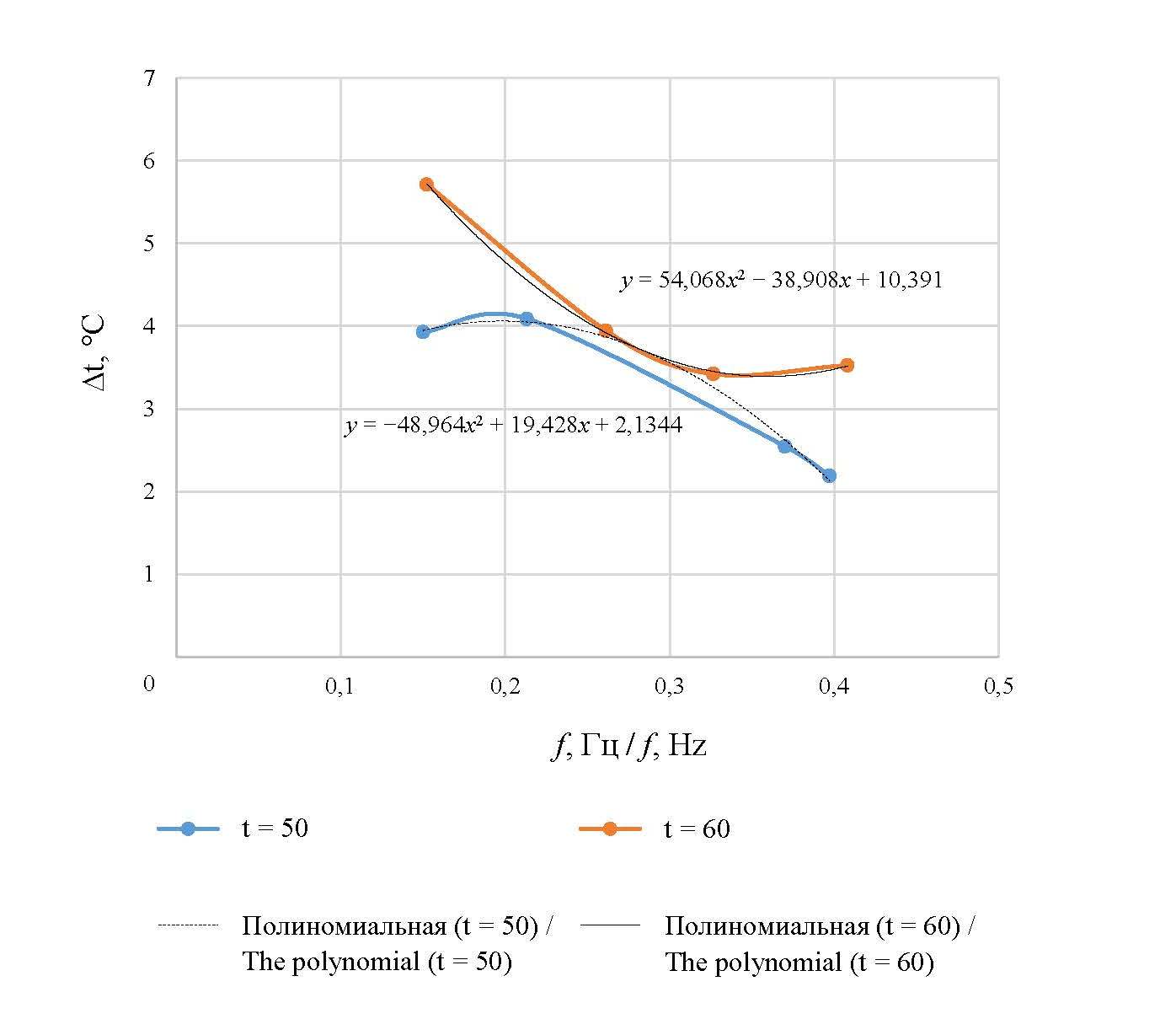 Материалы и методы. При установке экспериментальных зависимостей перепада температур для греющего и нагреваемого контуров отопления реверсивной теплопередачи по одной трубе от частоты пульсаций расхода теплоносителя при разных входных температурах в динамике использовались методы цепей, физического эксперимента, математической статистики. Физический эксперимент проводился последовательно при повышении и понижении температуры теплоносителя (50 и 60 °С).
