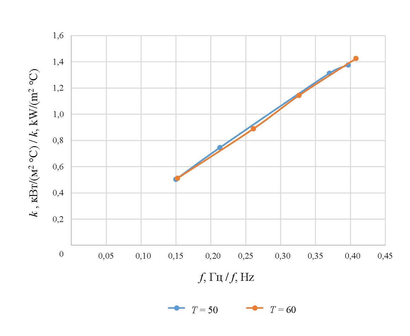 Рассмотрим график зависимости коэффициента теплопередачи от значения частоты работы мембранного насоса (рис. 4).