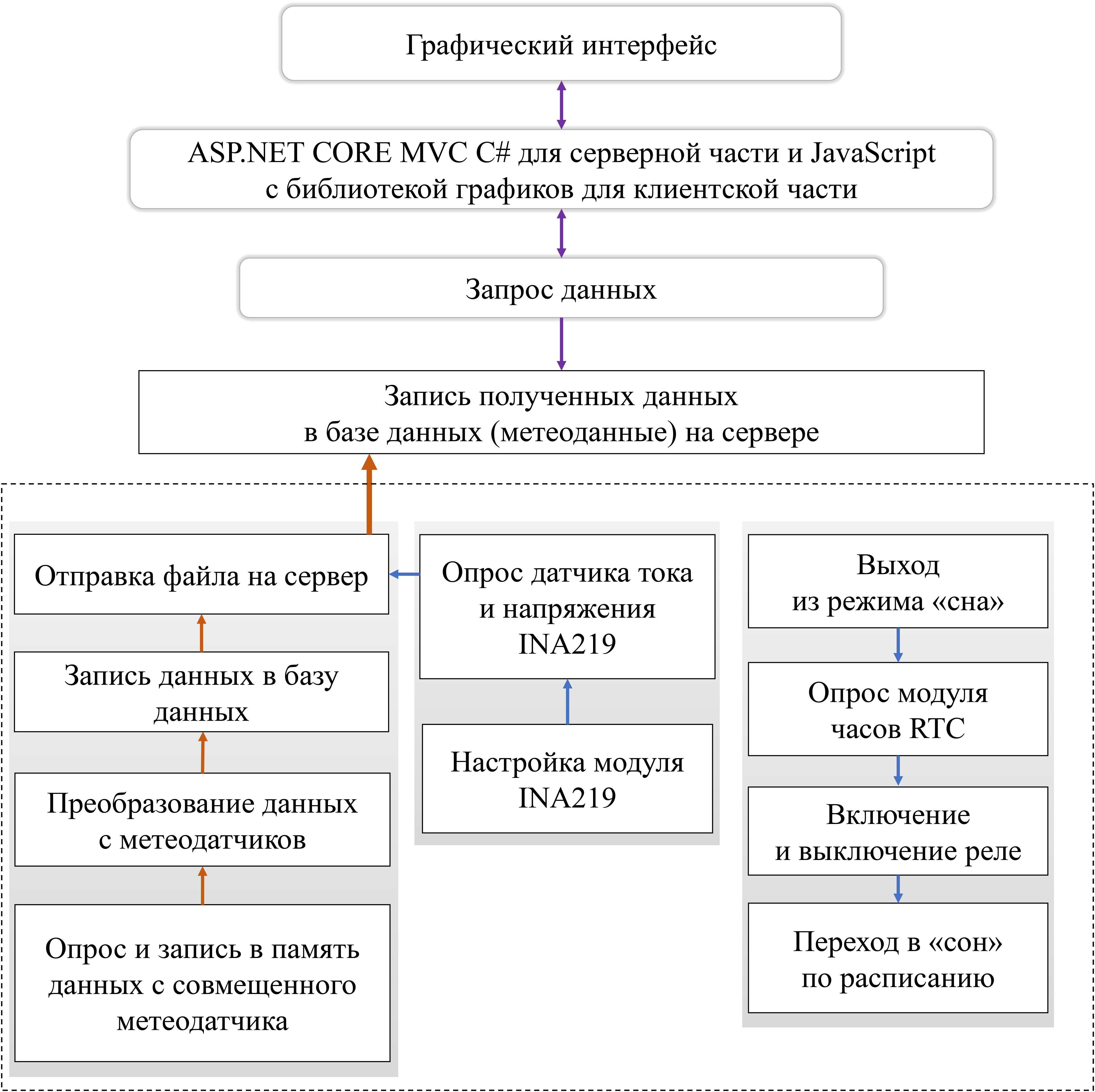 Для разработки набора приложений, анализа кода, рефакторинга на Java и microPython использвались IDE (интегрированная среда разработки) – IntelliJ IDEA 2022 и PyCharm 2022 соотвественно, cборка Java-проекта для АМС осуществлялась с использованием фреймворка Apache Maven. Программное обеспечение на Java для Pi Zero обеспечивает опрос совмещенного метеодатчика, подключение и запись показаний записи в локальную и удаленную систему управления базами данных PostgreSQL через интернет. Дублирование данных в локальную базу данных производится для сохранения данных на случай неудачного интернет соединения с сервером в связи с негативными погодными условиями. Программное обеспечение на microPython для контроллера Pi Pico обеспечивает периодический переход в режим сна всех компонентов АМС, кроме совмещенного датчика. Алгоритм работы АМС (рис. 3) реализует выход системы из режима сна по расписанию: включение реле, две минуты ожидания для загрузки операционной системы, создание стабильного интернет-канала передачи данных, опрос всех каналов совмещенного методатчика, опрос датчика тока и напряжения, преобразование данных, подключение к удаленной базе данных на сервере, завершение работы операционной системы, выключение реле после трех минут работы и уход в режим сна на 27 минут.