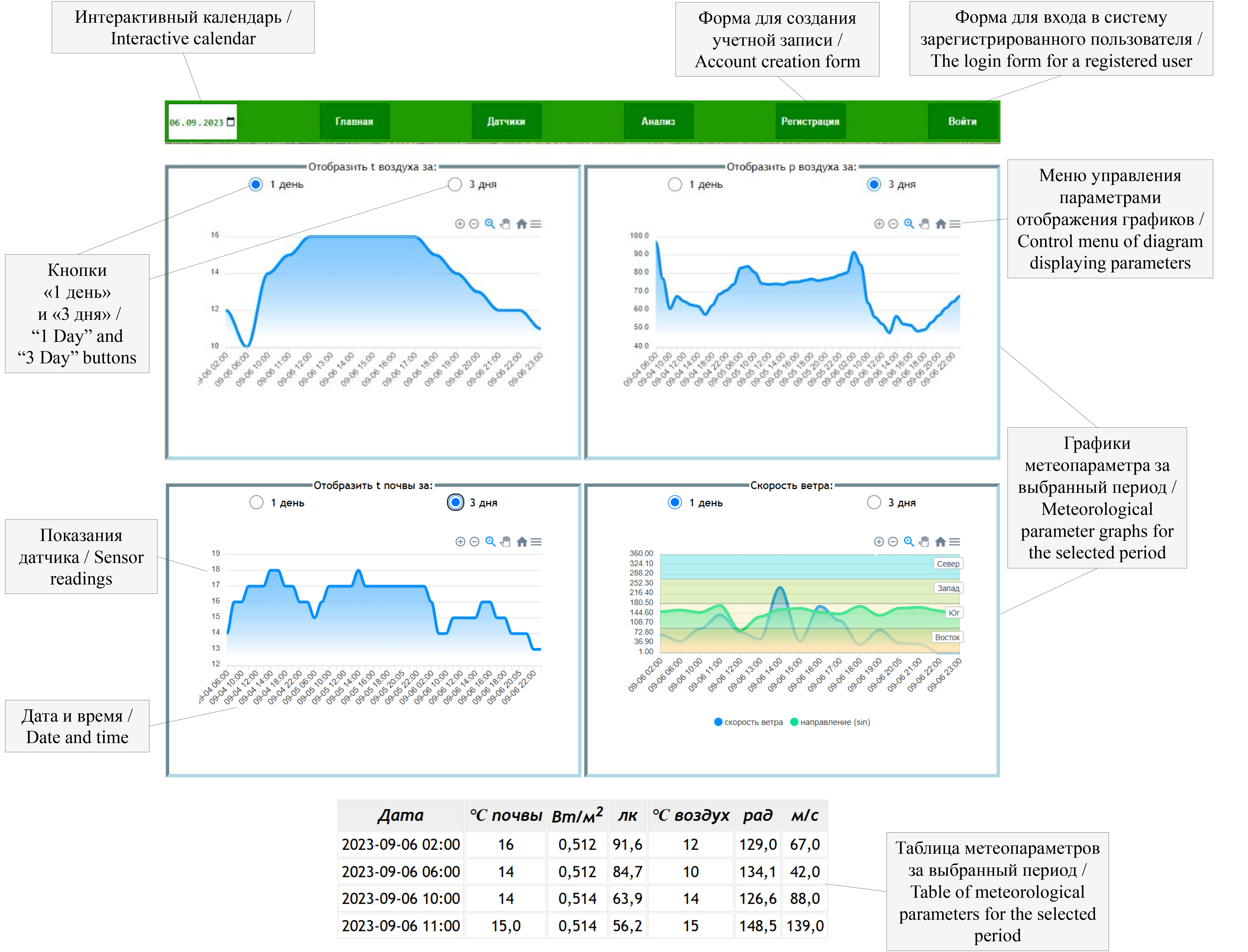 Introduction. The implementation of automated weather stations facilitated by Internet of Things (IoT) technologies represents a significant advancement in smart agriculture. Modern web services and applications using the data of IoT-based automated weather stations provide users with representative meteorological data on climatic conditions in real time to enhance the field operations management and reduce risks from changing in meteorological conditions. An important aspect of collecting and analyzing up-to-date meteorological information is the development of user-friendly interfaces.