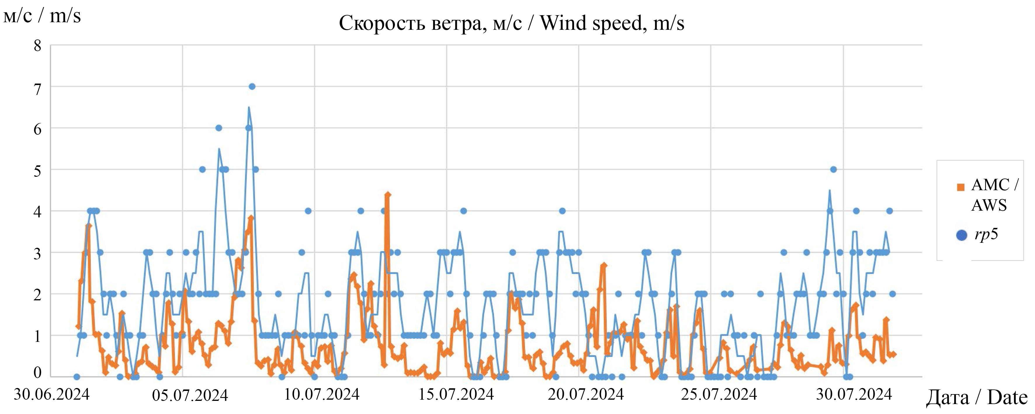 Рис. 7. Динамика скорости ветра по данным автоматической метеостанции и открытого источника
