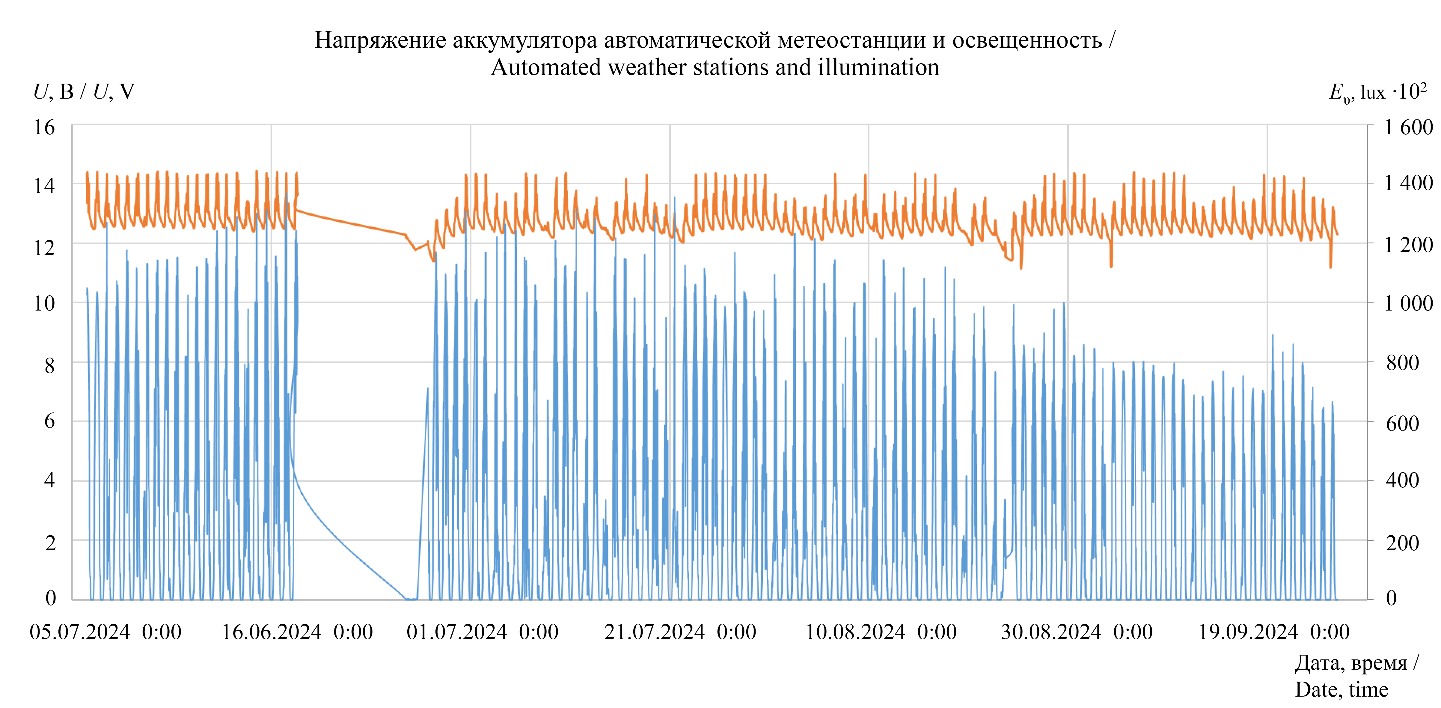 На рисунке 8 представлен график изменения напряжения аккумулятора IoT АМС. Отмечаются три случая просадки напряжения аккумулятора 23.08.2024, 3.09.2024 и 25.09.2024 в связи с негативным влиянием факторов окружающей среды, вызвавшим падение напряжения до установленной минимальной отметки 11 В из-за сильной облачности и проливных дождей, что видно по показаниям датчика освещенности. При этом напряжение аккумулятора за счет подзарядки от солнечной панели возвращалось к нормальному (более 12 В) уже на следующий день.