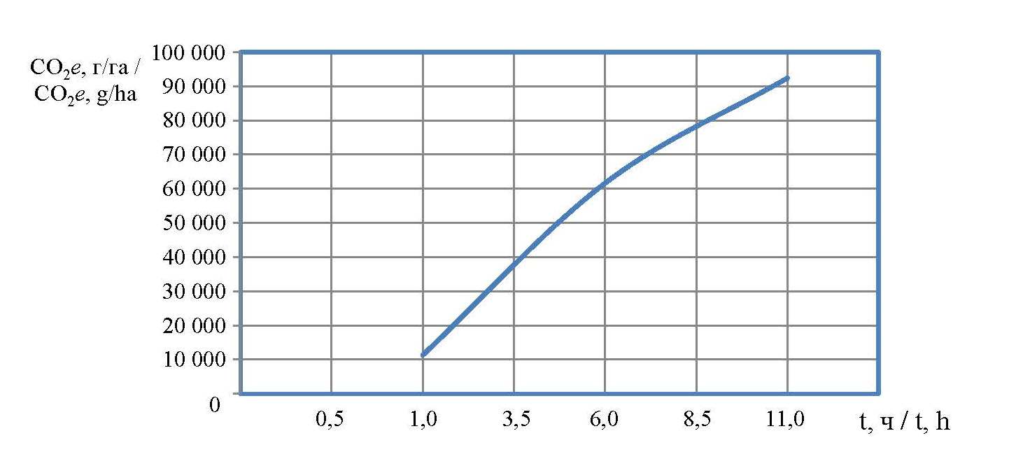 Таким образом, для рассматриваемого технологического процесса в конкретных условиях его выполнения эмиссия СО2 варьирует в пределах от 11 315 до 92 356 г с 1 га площади (или от 1,13 до 9,23 г с 1 м2) в течение 11 ч перед началом вспашки до начала последующей технологической операции.