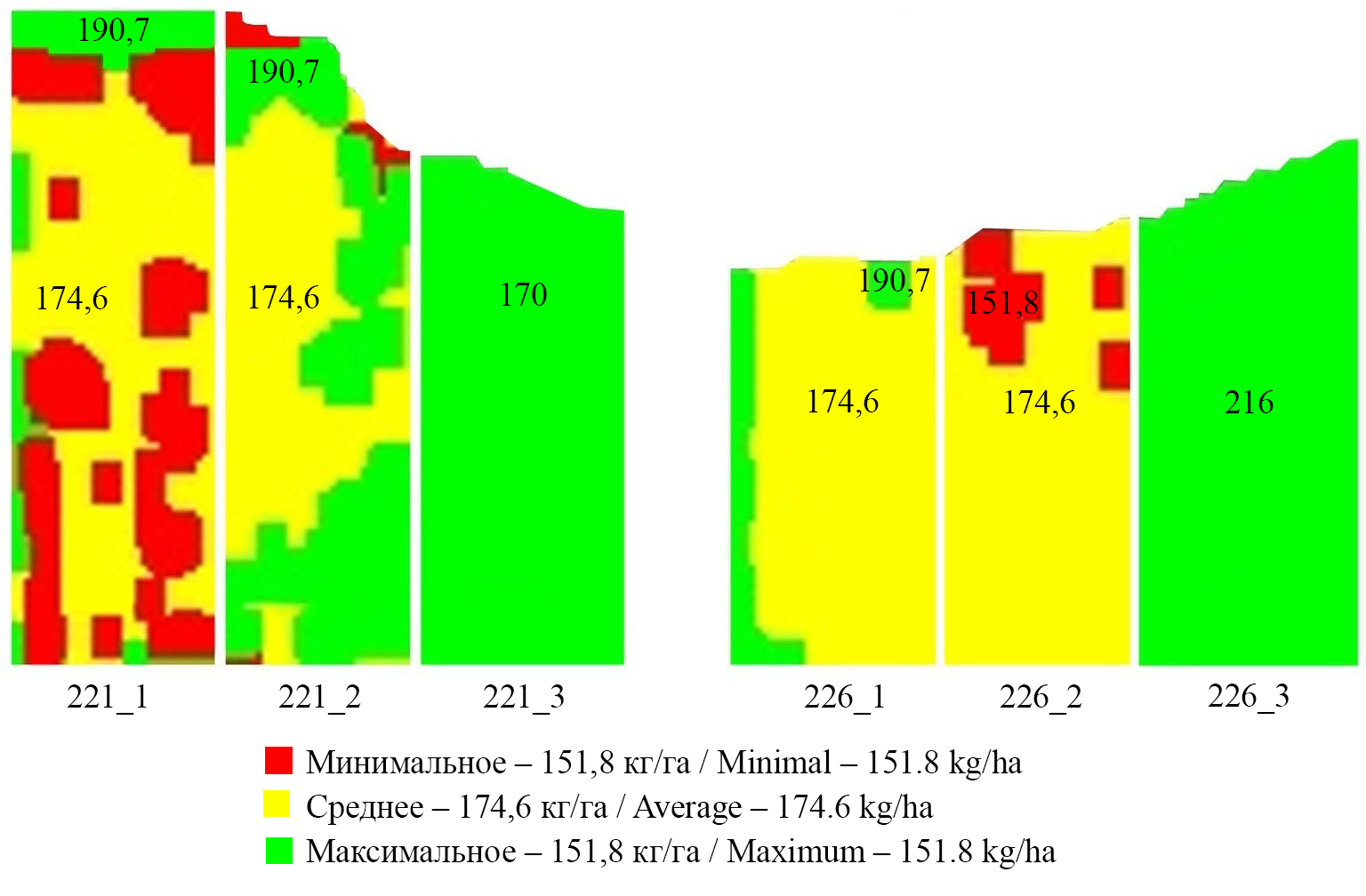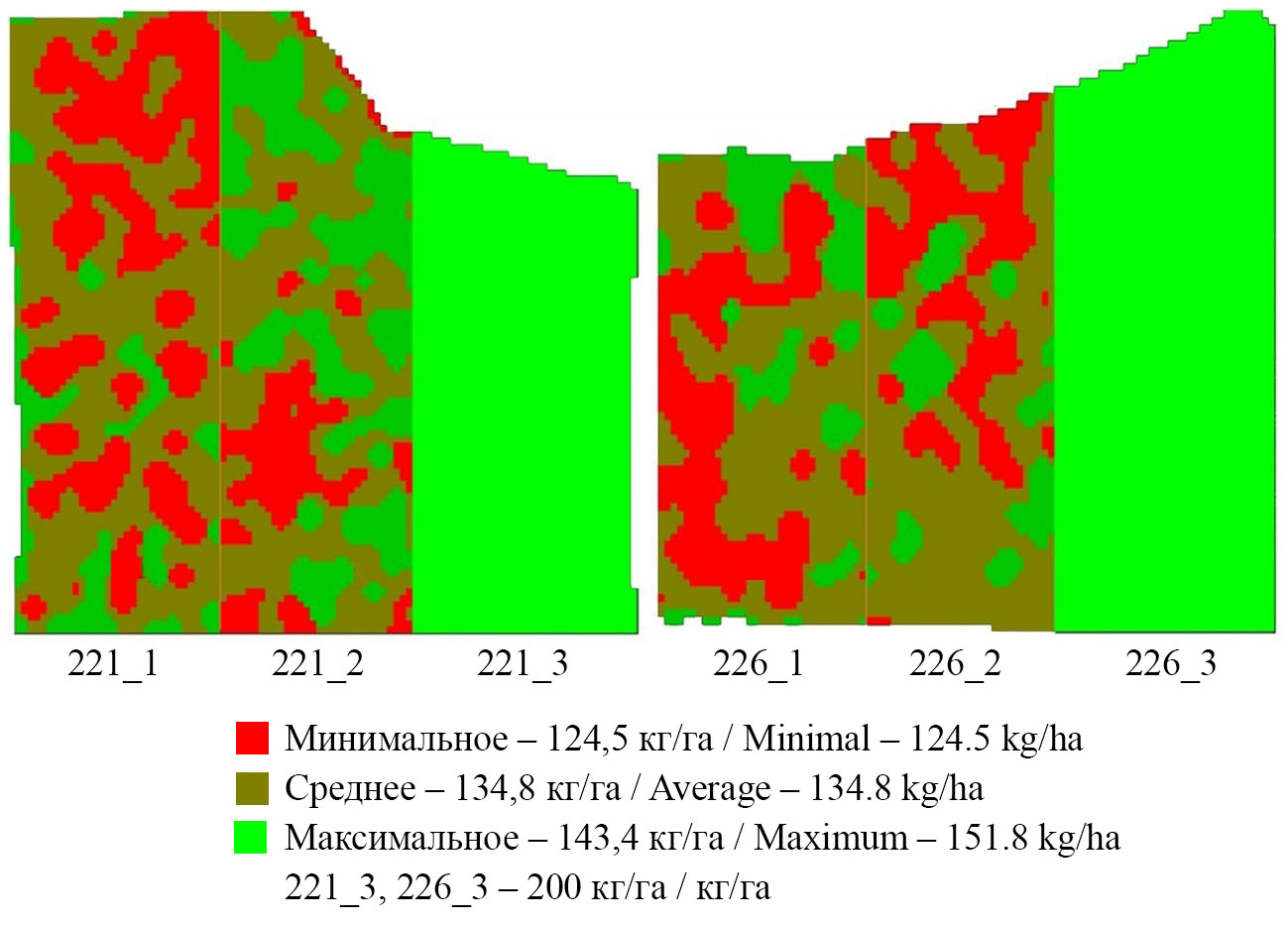 Для проведения сравнительных исследований предложенной ООО «ПрофАгро» модели экспериментальных исследований выбраны следующие поля в АО «Рассвет» Усть-Лабинского района Краснодарского края: поле № 221 (83 га); поле № 226 (68 га). Предшественником на обоих полях была кукуруза. Тип почвы – чернозем обыкновенный. Каждое поле было разделено на три варианта (рис. 1): 221_1, 226_1 – в зону низкой продуктивности вносилось больше удобрений; 221_2, 226_2 – в зону низкой продуктивности вносилось меньше удобрений; 221_3, 226_3 – удобрения вносились одной дозой (хозяйственная схема).
