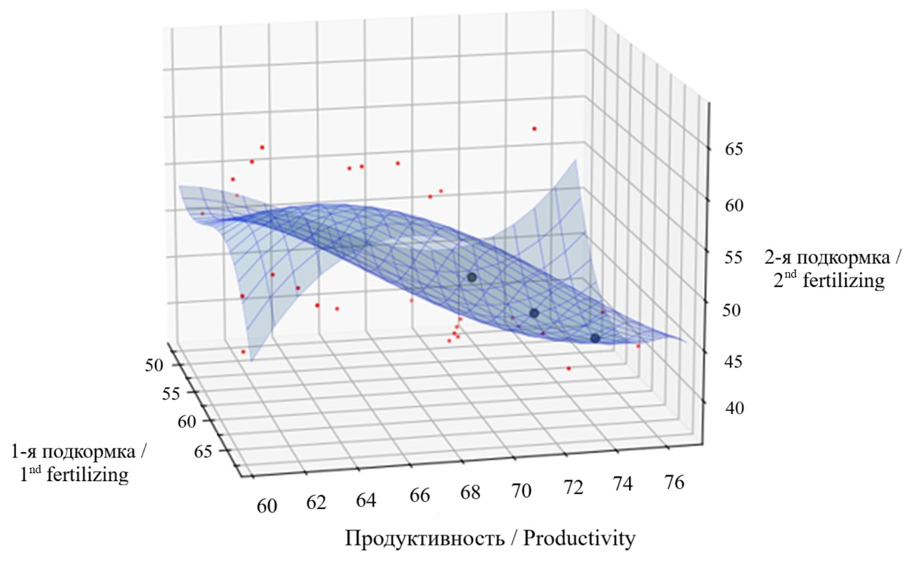 Для определения доз внесения селитры построен график зависимости урожайности от первой и второй подкормки по данным об урожайности за 2020–2023 гг. Была построена «обратная» зависимость второй подкормки от первой урожайности. Аппроксимирован график и получена трехмерная квадратичная плоскость (рис. 7).