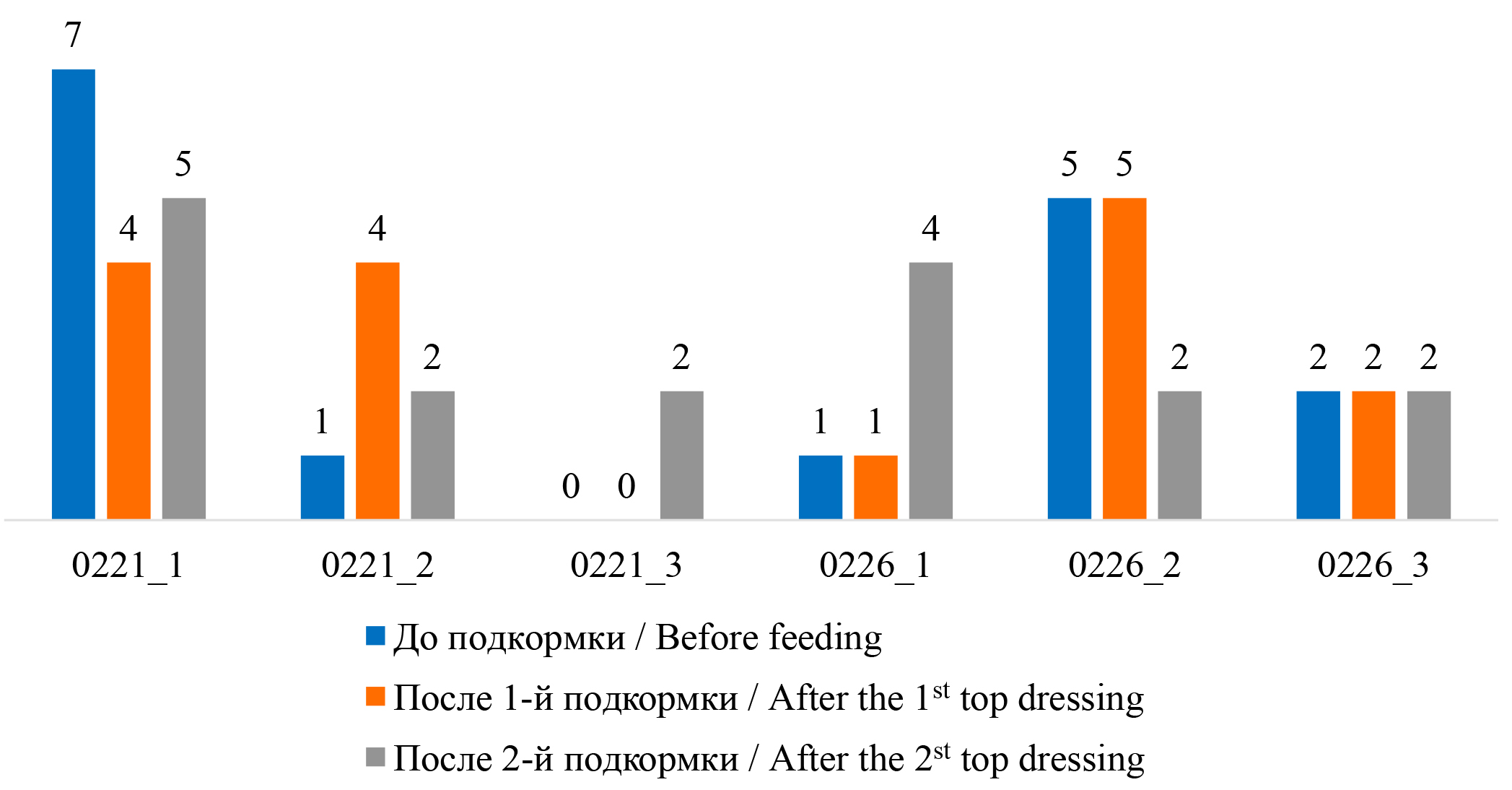 Наилучшие данные по усредненной урожайности показали варианты 221_1 и 226_2. Эти варианты имели оптимальные показатели размерно-массовых характеристик растений до проведения эксперимента (7 и 5 показателей соответственно). Для достоверности полученной урожайности по вариантам 221_1 и 226_2 и понятия насколько сработала в данных случаях модель ИИ при подкормках требуются трехлетние исследования в данной природно-климатической зоне.