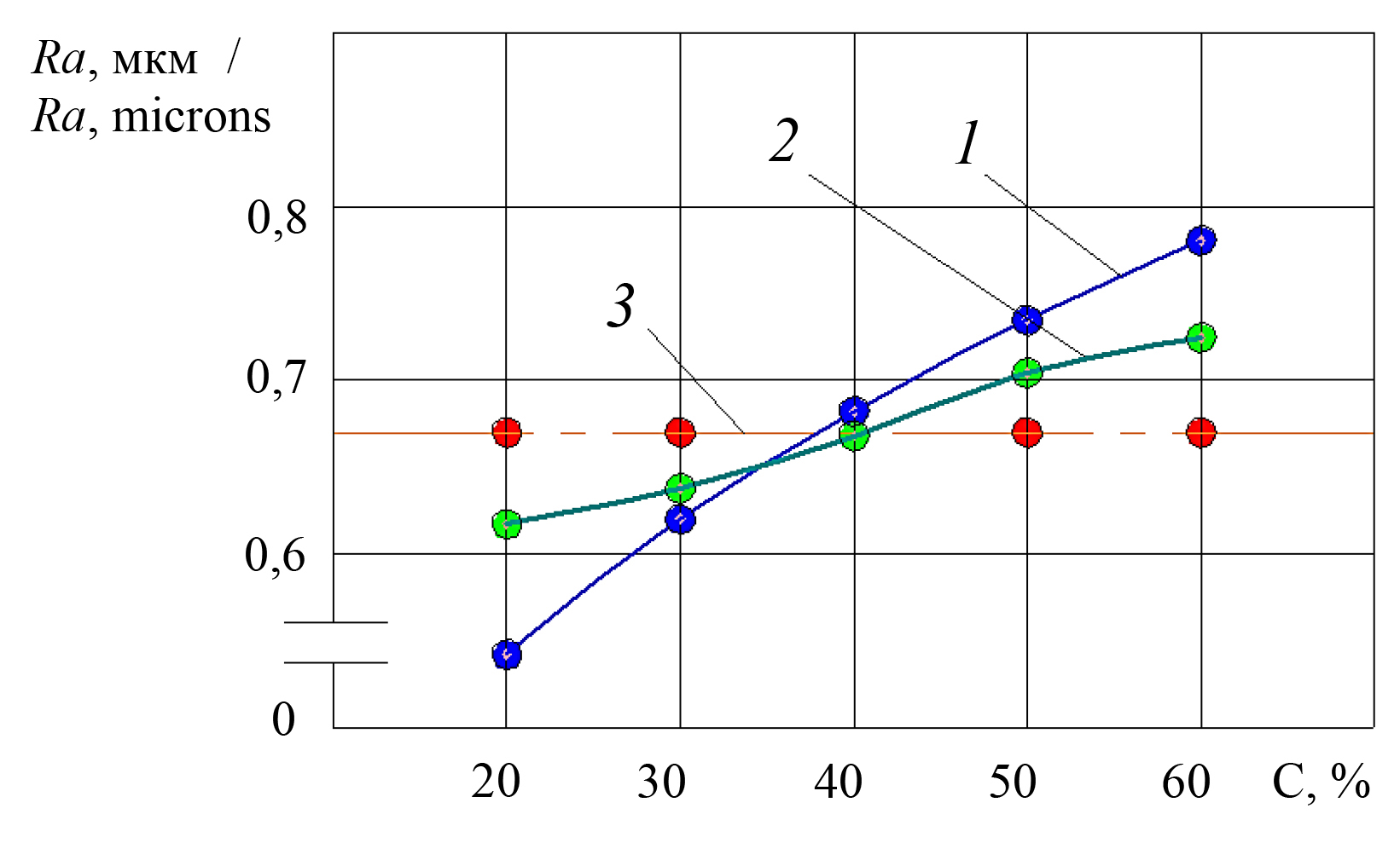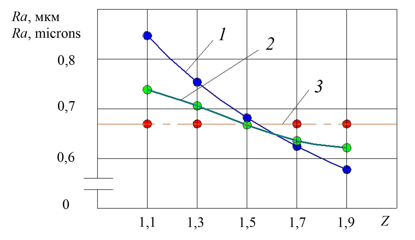 1 – experimental data; 2 – calculated dependence; 3 – limiting roughness level Ra